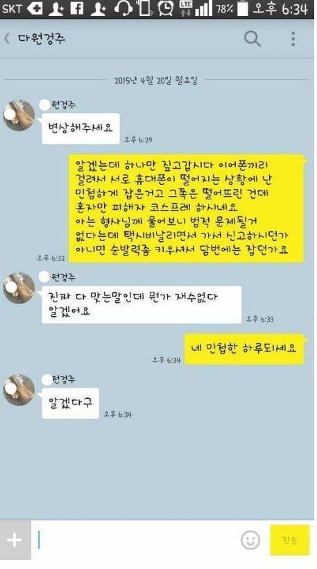 이어폰끼리 걸려서 서로 휴대폰이 떨어지는 상황에 난 민첩하게 잡은거고 그쪽은 떨어뜨린 건데 혼자만 피해자 코스프레 하시네요