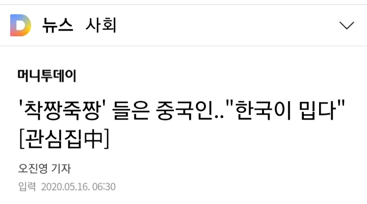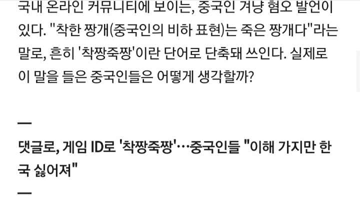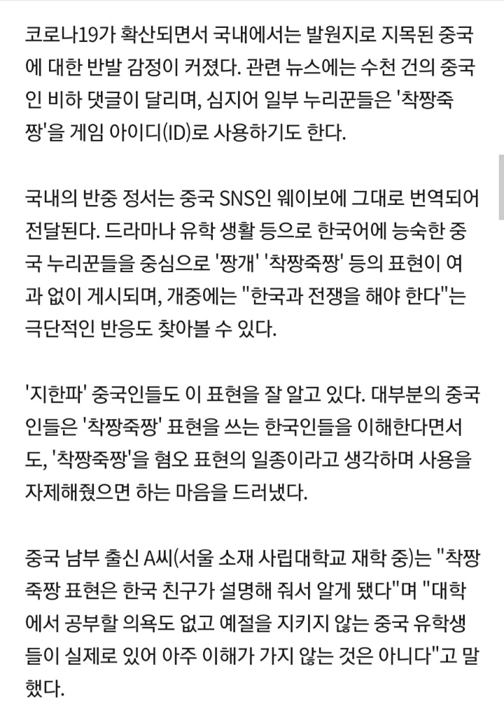 [스크랩] [여시뉴스데스크]'착짱죽짱' 들은 중국인.."한국이 밉다"[관심집中] 작성자박수망|작성시간20.11.03|조회수14,758 목록 댓글 175 글자크기 작게가 글자크기 크게가 출처 :https://news.v.daum.net/v/20200516063007095?f=m&from=mtop전문출처 다음검색 스크랩 원문 : *여성시대* 차분한 20대들의 알흠다운 공간 현재 게시글 추가 기능 열기 북마크 공유하기 신고 센터로 신고 댓글 댓글 175 댓글쓰기 답글쓰기 댓글 리스트 작성자자몽선키스트 | 작성시간 20.11.04 착짱죽짱 작성자오리가 으악 | 작성시간 20.11.04 타투해! 작성자Better things are coming | 작성시간 20.11.05 착짱죽짱!!!!!!!!! 작성자뚱땅이와 삼색이 | 작성시간 20.11.05 웅 착짱죽짱~ 작성자Bergminze_Ricola | 작성시간 20.11.05 착짱죽짱~! 댓글 전체보기