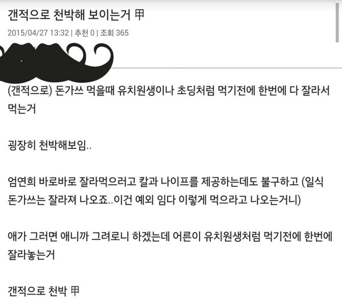 [스크랩] [흥미돋]???: 돈까스 먹을때 천박해 보이는거 작성자머쓱타드|작성시간20.11.06|조회수10,474 목록 댓글 76 글자크기 작게가 글자크기 크게가 출처 : 여성시대 머쓱타드엄연희씨 누구세요 다음검색 스크랩 원문 : *여성시대* 차분한 20대들의 알흠다운 공간 현재 게시글 추가 기능 열기 북마크 공유하기 신고 센터로 신고 댓글 댓글 76 댓글쓰기 답글쓰기 댓글 리스트 작성자마성의빵빵덕 | 작성시간 20.11.06 존나웃ㄱㅕ 니는 피카츄 돈까스도 썰어먹어러라 작성자호로록김치우동 | 작성시간 20.11.06 엄연희라고쓰는게 훨 천박해보인다 ㅅㅂ 작성자E-mail | 작성시간 20.11.06 연희씨... 작성자오늘 하루도 수고하셨습니다 | 작성시간 20.11.06 그려로니가 더 천박해 작성자Amoroso | 작성시간 20.11.07 남이사 내맘인데? ㅎㅎ 댓글 전체보기