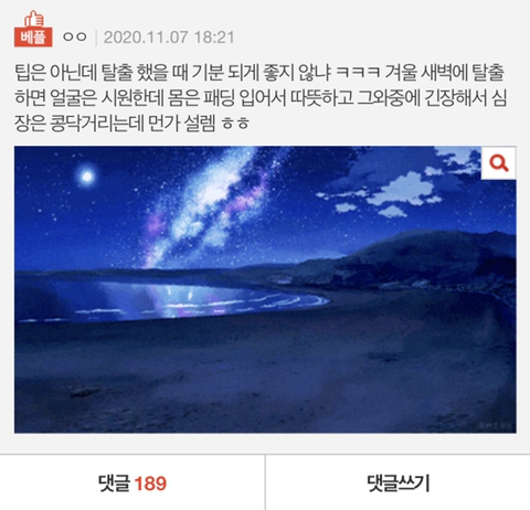 작성자티끌모아보자 작성시간 20.11.11 나 새벽탈출해서 택시탓는데 택시기사님 울아빠 친구여서 다시 집앞으로간거 생각나네ㅋㅋ아저씨가 암말없이 우리집으로가심..흑흑