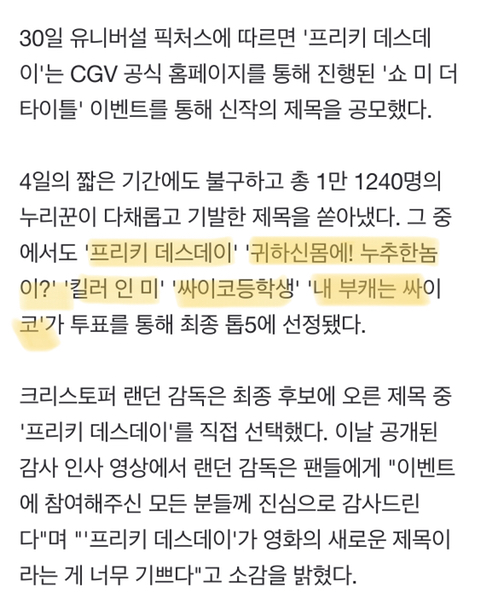 영상보면 프리키 + (해피)데스데이 합친걸로 감독이 뽑았댜
