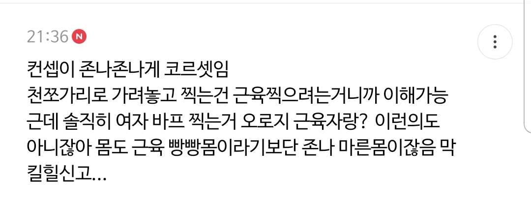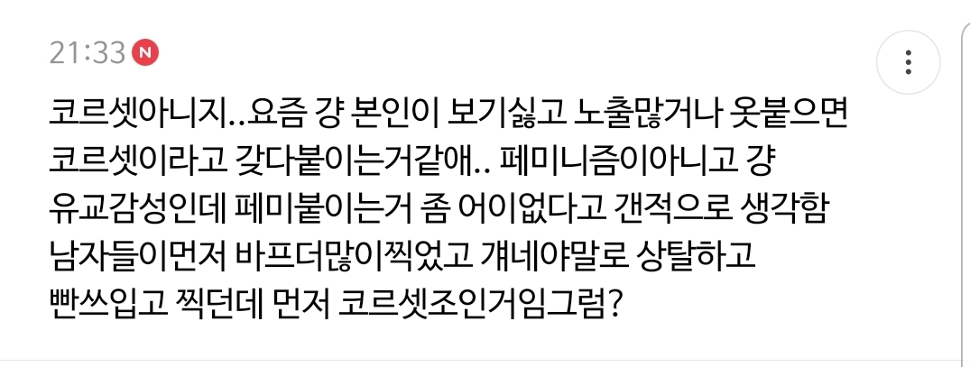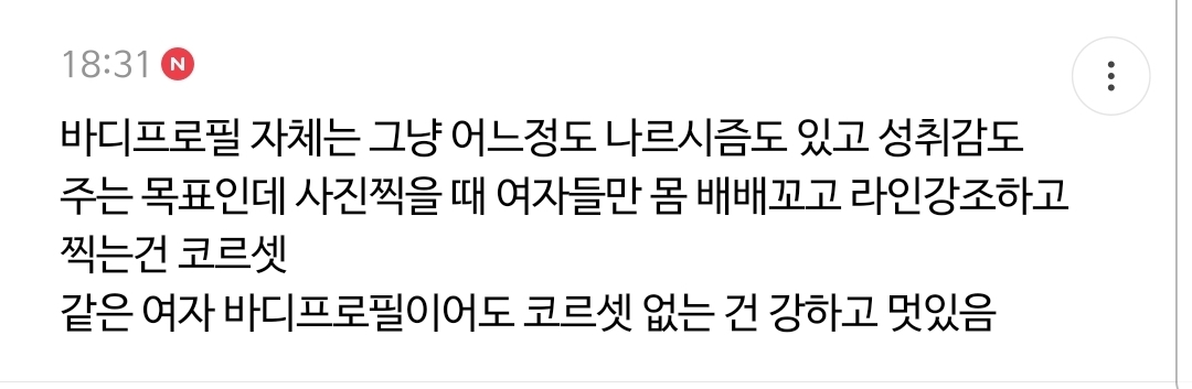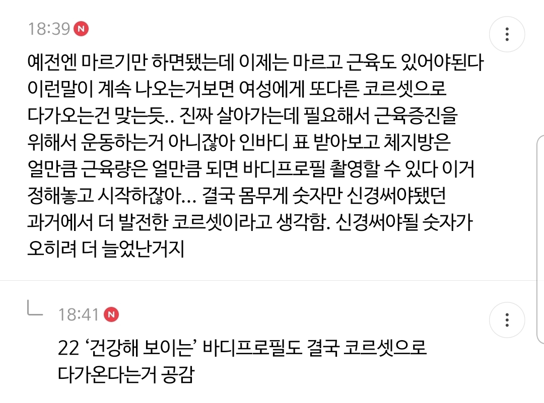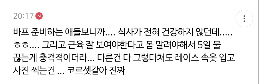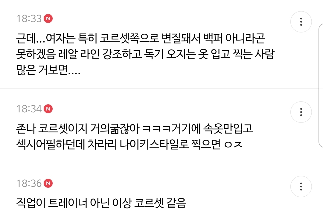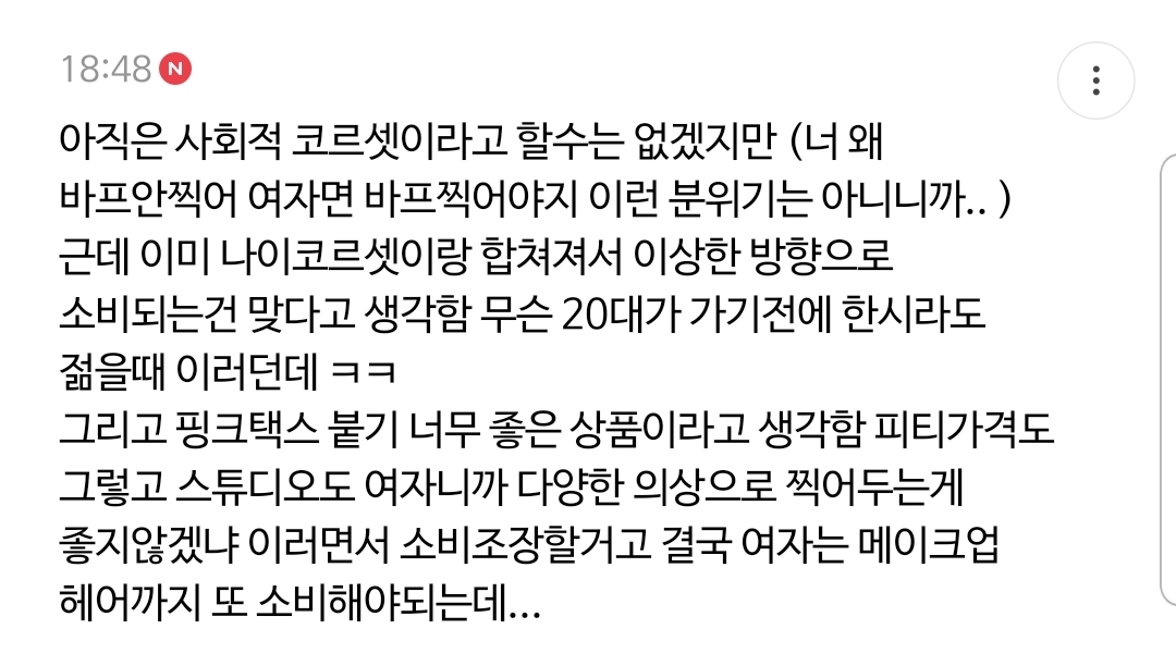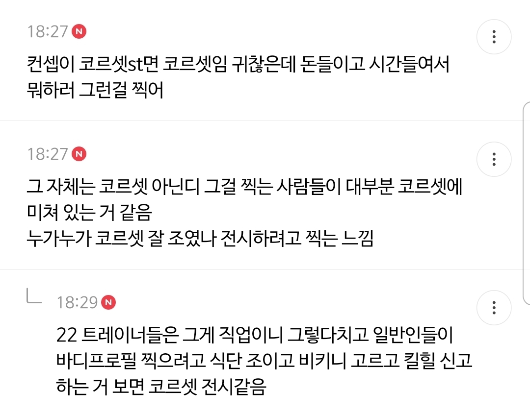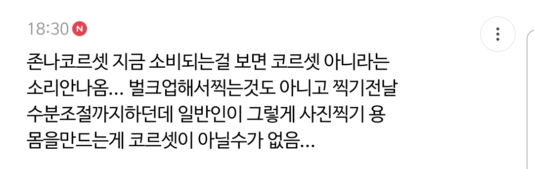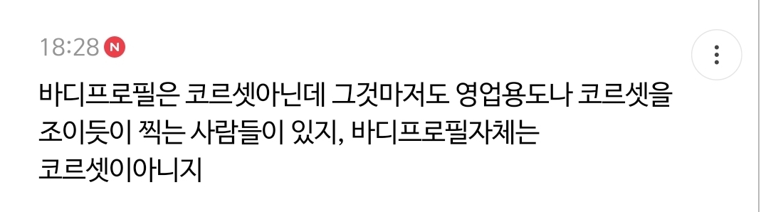 작성자달면삼키고쓰면뱉~보이다운 작성시간 20.11.24 몸만드는거까지는 코르셋아닌디,,, 스튜디오만 들어가면 코르셋이더라,,,? 가슴도 보정해준다고 신나하던 내친구보면 코르셋인 부분도 있는것 같아