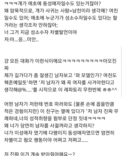 작성자멘붕되어나빌레라 작성시간 20.11.24 원래 다수에 속한 사람들은 다수가 하는 행동이 보편적이 되어 아무런 인지조차 없이 편안하게 행동을 하고 살다가, 그것을 지적하거나 바꾸라 하거나 하면 불편을 느끼지. 나의 편함을 놓을 수 없는 거야. 난 그냥 살던대로 살았을 뿐인데 이게 왜 잘못인지도 모르겠고, 그것을 지적하면 예민하다고 치부하지. 글쓴이 평소에도 온통 남자이야기만 할거라는 촉이 온다.