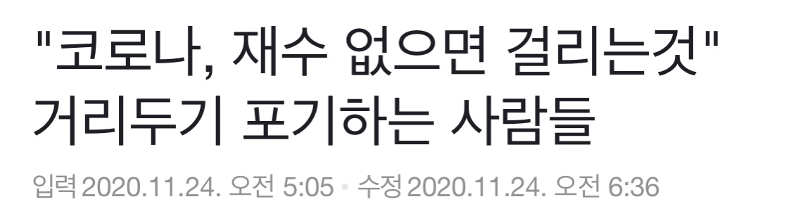 작성자고래새우튀김 작성시간 20.11.24 친구들 안만나고 마스크 계속 쓰고 다니고 있지만... 운없으면 걸린다는 생각은 하는중...