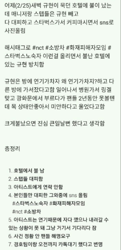 6. 규현 솔로 콘서트 당시 규현이 묵고 있던 호텔에서 화재가 나자 호텔에 두고 매니저+스텝들만 나옴.