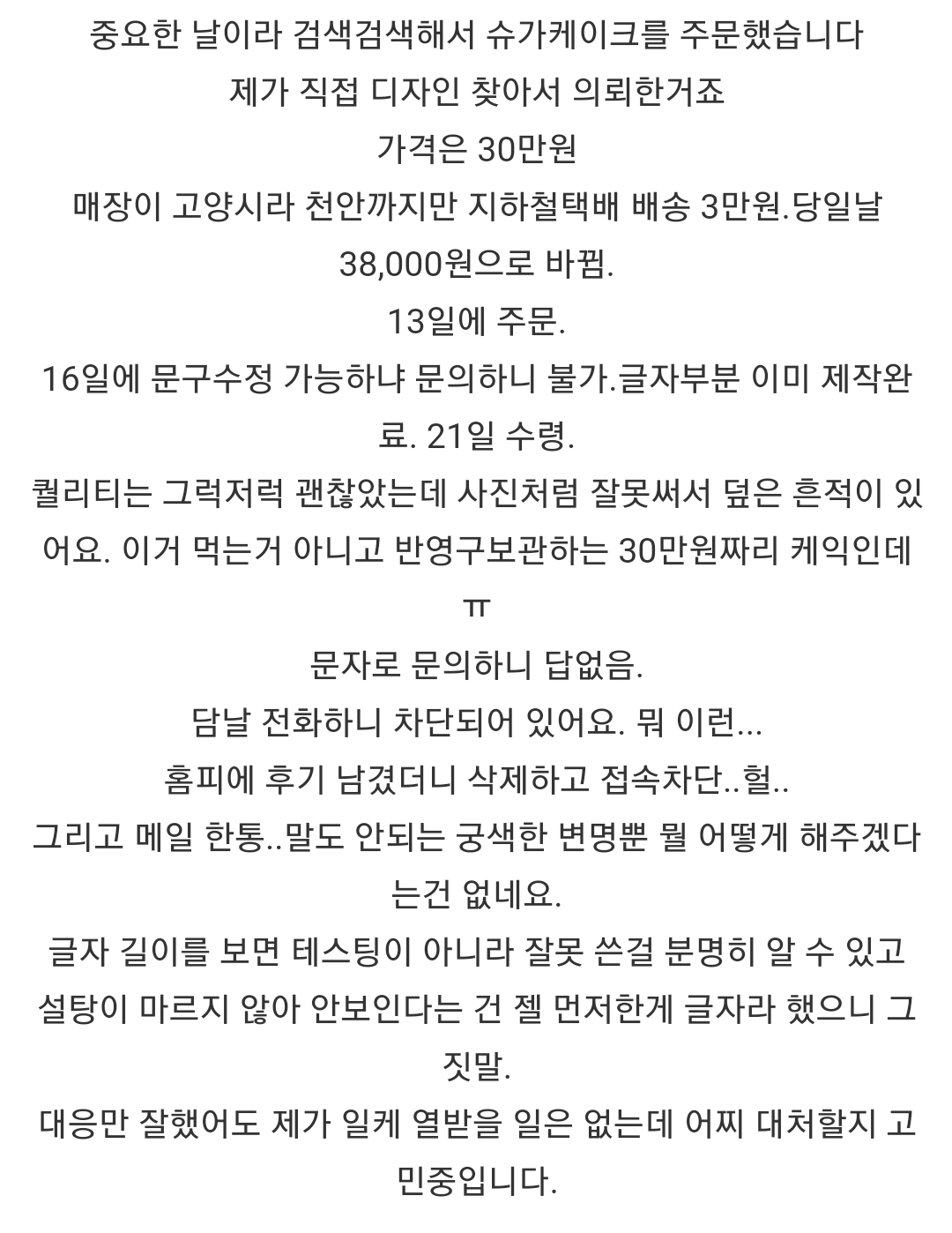 [기타]인터넷에서 논란 중인 30만원짜리 케이크.jpg 작성자그린티라떼샷추가|작성시간20.12.04|조회수26,871 목록 댓글 41 글자크기 작게가 글자크기 크게가 출처 : 여성시대 그린티라떼샷추가www.cafe-sultan*.co*와 저걸 30에 파냐... 다음검색 현재 게시글 추가 기능 열기 북마크 공유하기 신고 센터로 신고 댓글 댓글 41 댓글쓰기 답글쓰기 댓글 리스트 삭제된 댓글입니다. 답댓글 작성자더바디샵거품망 | 작성시간 20.12.05 산ㅋㅋㅋㅋ돌ㅋㅋㅋㅋ광숰ㅋㅋㅋㅋ 작성자안티히어로 | 작성시간 20.12.05 30..? 와.. 가격도 에바인데 대처 뭐야ㅋㅋ 작성자크리스탈팔레스 | 작성시간 20.12.05 양심너무없다 작성자띠요오옹오옹 | 작성시간 20.12.05 아니 ㅅㅂ 다음번에 어쩌라고 나는 지금 당장 빡치는뎈ㅋㅋㅋㅋㅋ 댓글 전체보기