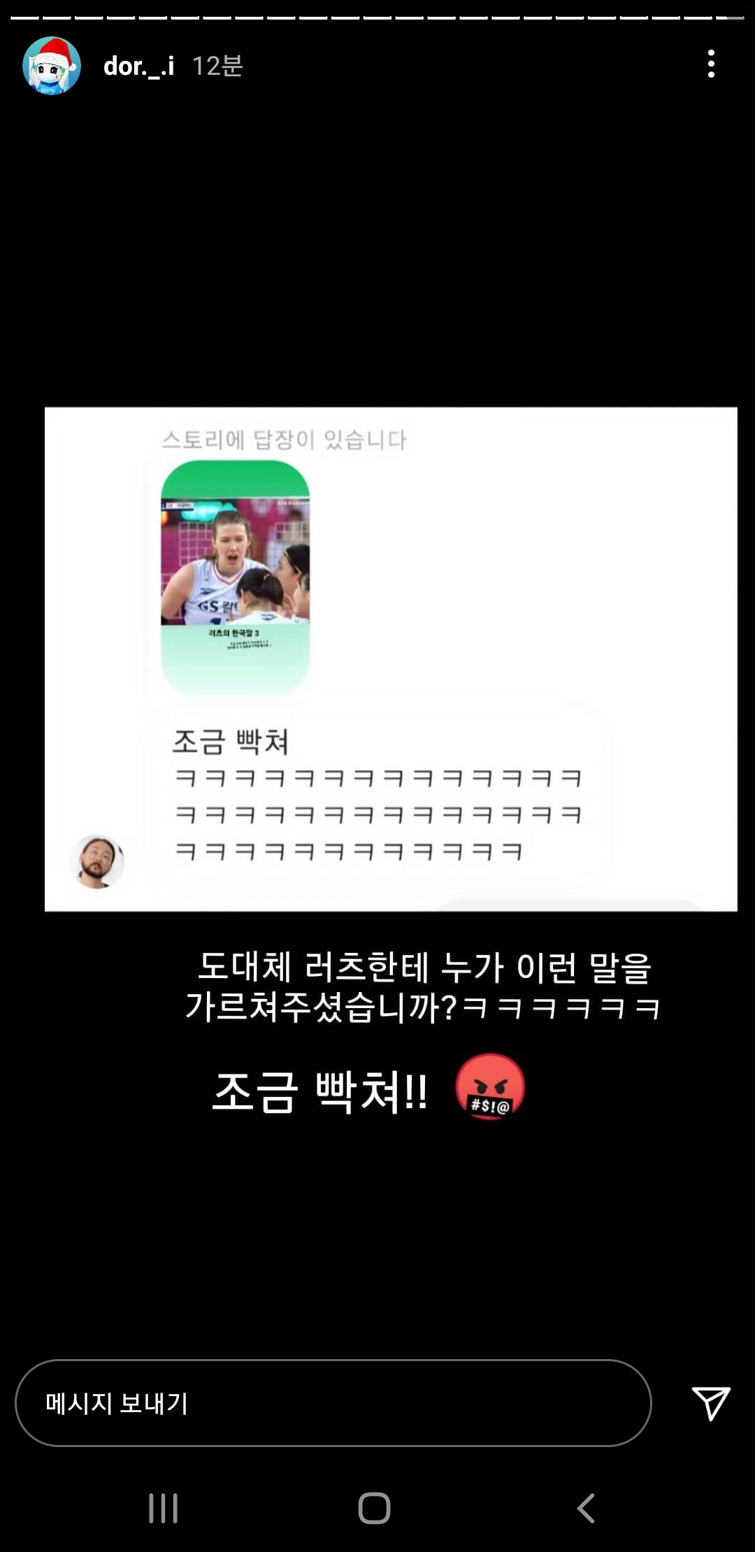 [흥미돋]입모양만 보고 외국인 선수가 한 말 맞히기 작성자이소영 마누라|작성시간20.12.06|조회수12,626 목록 댓글 18 글자크기 작게가 글자크기 크게가 출처 : 여성시대 이소영 마누라 1. 더 높혀줘2. 암쏘퍽킹3. 아 좀 아팠어4. 조금 빡쳐5. 좀 더 퍼줘6. 아님 빼줘정답은 사진 밑에 있음4번~~!!조금 빡쳐였습니다~~~(답장 출처: 인스타그램 도리도리 님 https://instagram.com/stories/dor._.i/2457469595340487571?utm_source=ig_story_item_share&igshid=1uwumig2q8atf) 다음검색 현재 게시글 추가 기능 열기 북마크 공유하기 신고 센터로 신고 댓글 댓글 18 댓글쓰기 답글쓰기 댓글 리스트 작성자사과잣 | 작성시간 20.12.06 헐 맞춤!!ㅋㅋㅋㅋㅋㅋㅋㅋㅋ 작성자팔오오플 | 작성시간 20.12.06 너무 빡치신것같은데요ㅋㄱㄱㅋㄱㄱㄱ 작성자초록빛 바닷물에 두손을 담그면 | 작성시간 20.12.06 존나 빡쳐인줄 입모양은 아닌데 표정이 좀 빡친게 아닌거 같아서.. 작성자1 and Only | 작성시간 20.12.06 조금 빡친게 아닌거같은데요ㅋㅋㅋㅋㅋㅋㅋㅋㅋㅋ 작성자치킨내방으로 | 작성시간 20.12.06 아 러츠 ㅜㅜㅋㅋㅋㅋㅋㅋㅋㅋㅋㅋㅋㅋㅋㅋㅋㅋㅋㅋㅋㅋ 댓글 전체보기