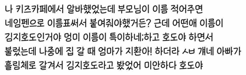 [스크랩] [흥미돋]나 키즈카페에서 알바했었는데 어떤 애 이름이 김지호도인거야 작성자미란이랩겁나잘해|작성시간20.12.06|조회수22,580 목록 댓글 80 글자크기 작게가 글자크기 크게가 출처 : https://www.facebook.com/1643216552631382/posts/2925797287706629/?extid=LvV2xJpBsoLyAp4r&d=n 다음검색 스크랩 원문 : *여성시대* 차분한 20대들의 알흠다운 공간 현재 게시글 추가 기능 열기 북마크 공유하기 신고 센터로 신고 댓글 댓글 80 댓글쓰기 답글쓰기 댓글 리스트 작성자원천징수 | 작성시간 20.12.06 저 이름표같은거에 김지호도 이쁘게 적혀있는게 존나웃겨 ㅋㅋㅋㅋㅋ 작성자빠라빙빠라붕붕붕 | 작성시간 20.12.06 ㅋㅋㅋㅋㅋㅋㅋㅋㅋㅋㅋㅋㅋㅋㅋㅋㅋㅋㅋㅋㅋㅋㅋㅋㅋㅋㅋㅋㅋ 작성자I’m seized by desire. | 작성시간 20.12.06 효도 작성자-15kg!! | 작성시간 20.12.06 ㅋㅋㅋㅋㅋㅋㅋㅋㅋㅋㅋㅋㅋ 빵터짐 작성자nozam | 작성시간 20.12.06 진짜편견없엌ㅋㅋㅋㅋㅋㅋㅋ 댓글 전체보기
