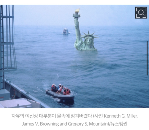 사진 속 자유의 여신상은 거의 어깨까지 물이 차올랐다. 사람들은 보트를 타고 근처를 돌아다니고 있다.