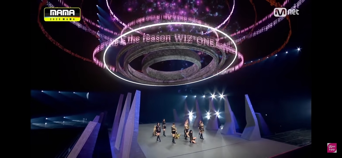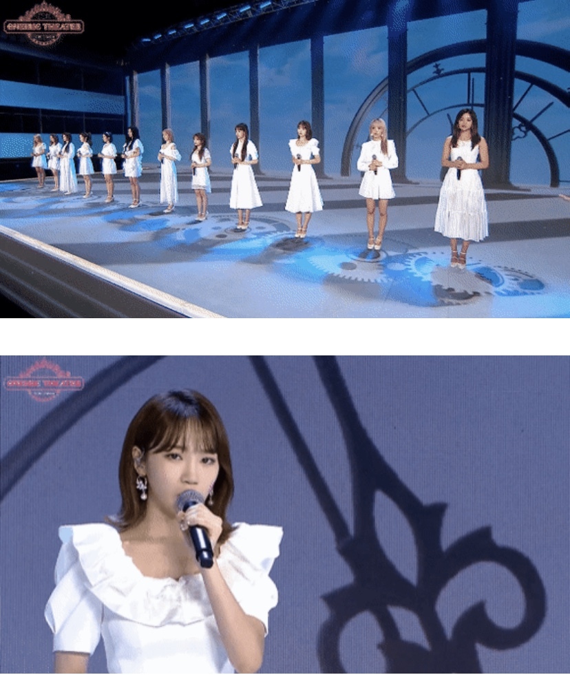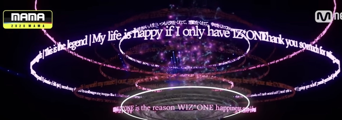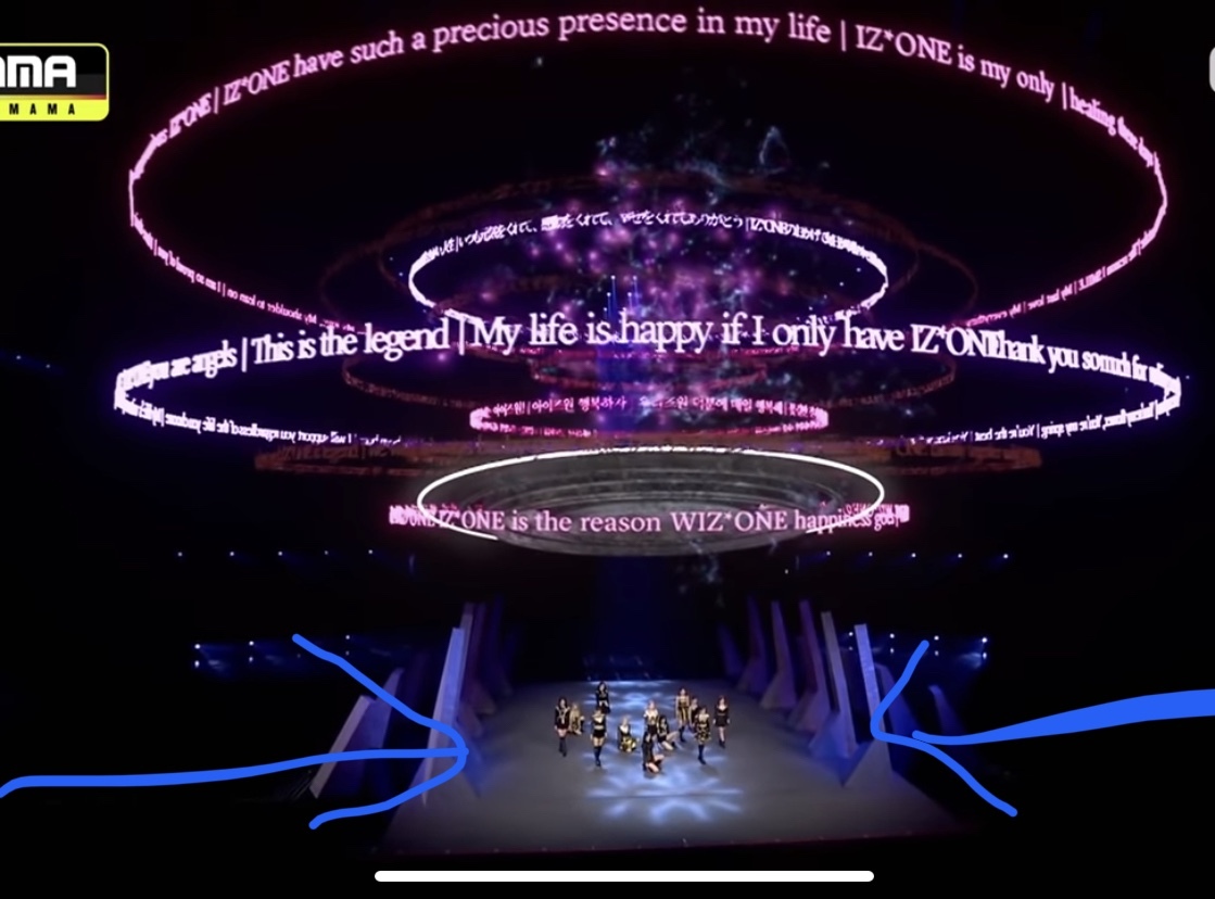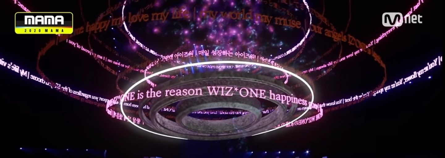 아이즈원이 무대를 하는 도중 노래가 끊김 그리고 대형을 맞추더니 노래가 멈추고 천장에서 팬들의 응원메시지가 원형으로 생성