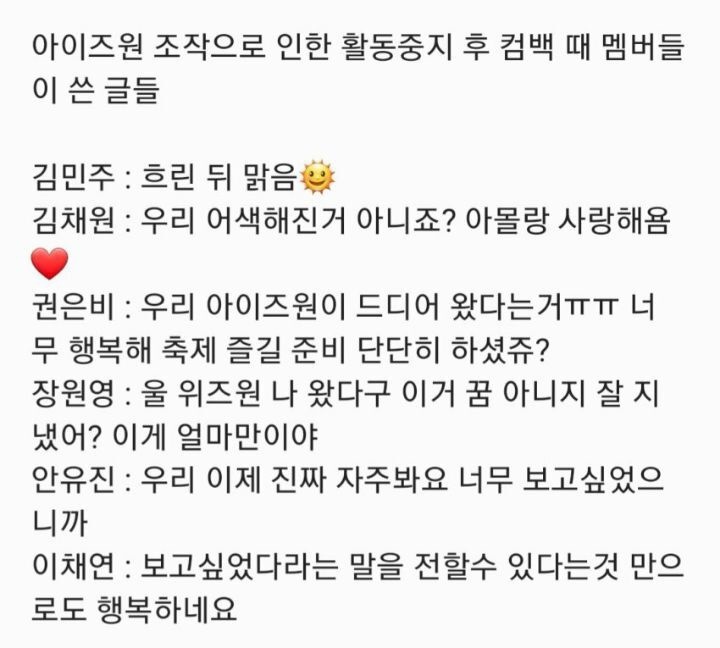 메시지 내용: 아이즈원이 있어서 행복해, 영원히 함께하자, 위즈원(팬클럽이름)은 아이즈원이 있어서 행복해