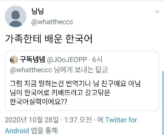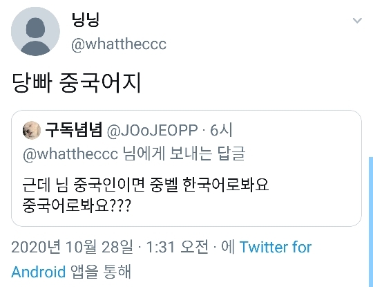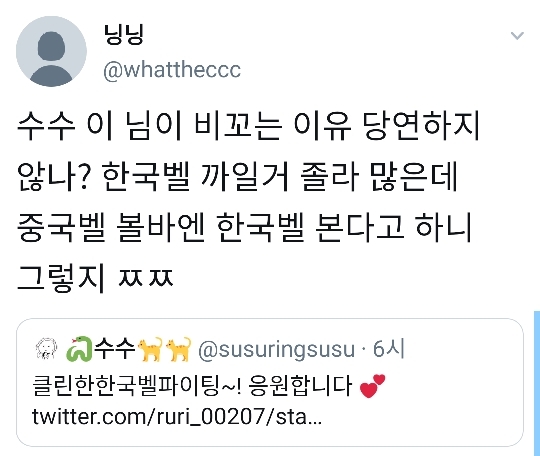 (부모님한테 배워서 한국어하고 웨이보만 하다가 한국커뮤에서 중벨 까이니까 열받아서 트위터 하신다함~ 시진핑 너무 잘하고있고 나라먹으면 어차피 그나라 역사되는거라는둥 빻)