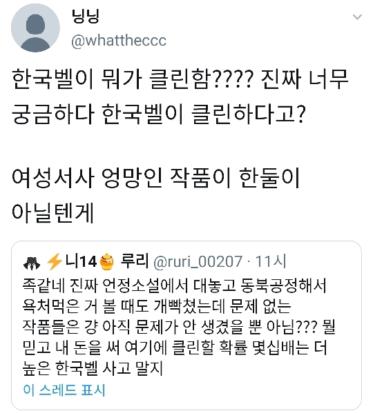 한국벨 클린하다고? 하면서 여성서사 운운하는거