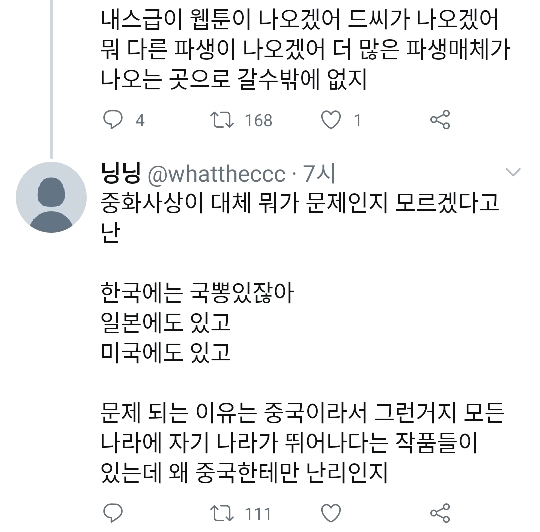 아래처럼 한국 후려치면서 중국사상 적극옹호하는거보고 역시 중국인은 답이없구나 싶었는데