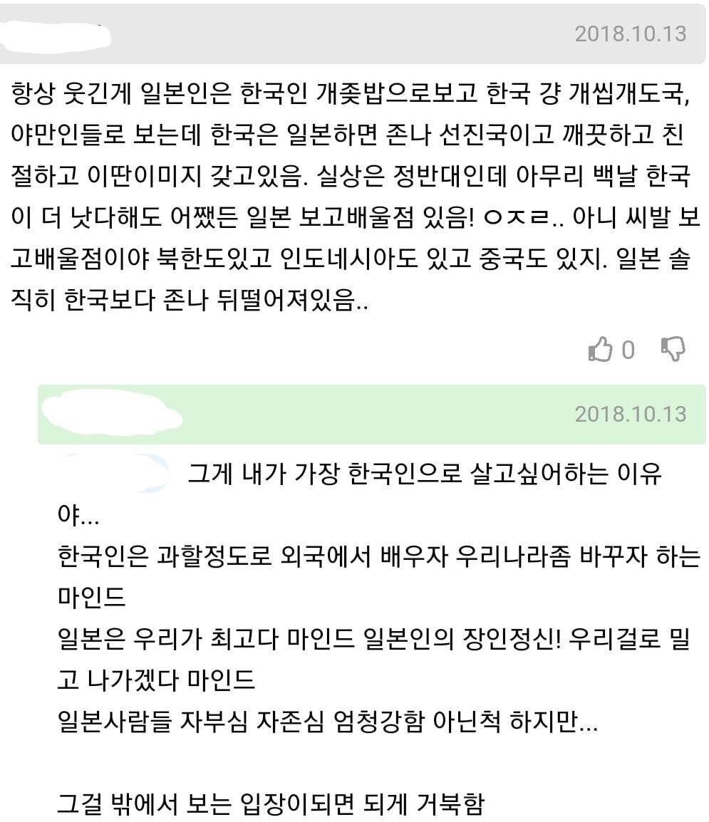 작성자부채표활명수 작성시간 20.12.16 막댓 공감간다 ㅋㅋㅋ 우리나라 사람들은 일본 싫다 싫다해도 결론적으로는 그래도 일본이 배울거 많다~이러는데 일본인들은 한국요리 대단해 한국 아이돌 대단해 하면서도 그치만 조금 국민성이랄까...하면서 개무시함 ㅋㅋ