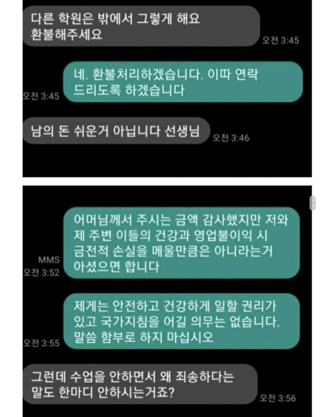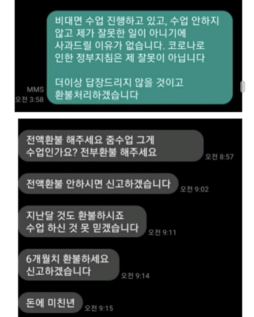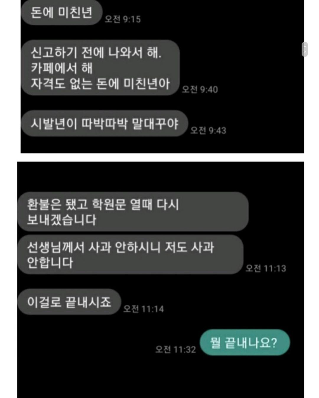 [기타]학원선생님에게 진상 피우는 학부모.jpg 작성자그린티라떼샷추가|작성시간20.12.20|조회수10,568 목록 댓글 55 글자크기 작게가 글자크기 크게가 출처 : 여성시대 그린티라떼샷추가가만히 있던 애는 선생님 얼굴 어찌보라고...ㅠㅠㅠ 다음검색 현재 게시글 추가 기능 열기 북마크 공유하기 신고 센터로 신고 댓글 댓글 55 댓글쓰기 답글쓰기 댓글 리스트 작성자경동나비엔 | 작성시간 20.12.20 선생님 말 잘하신다 작성자박해이 | 작성시간 20.12.20 뭘 끝내ㅋㅋ얼탱 작성자박고원 | 작성시간 20.12.20 와......... 작성자대한민국소방관 | 작성시간 20.12.21 진짜 못배워먹었다ㅋㅋㅋ 지 뜻대로 안되니까 욕하는 수준봐 미친 작성자말아상궈주실래요 | 작성시간 20.12.21 와 미쳤네... 저러면서 뭘 다시 보낸대? 저급 댓글 전체보기