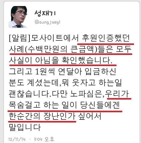 성재기가 후원요청을 하고