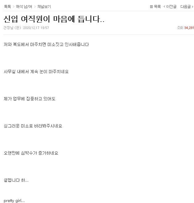 [스크랩] [기타][네이트판]신입 여직원이 마음에 듭니다.. 작성자와라이노;;|작성시간20.12.20|조회수9,459 목록 댓글 18 글자크기 작게가 글자크기 크게가 출처 : pann.nate.com/talk/356208994신입 여직원이 마음에 듭니다..저와 복도에서 마주치면 미소짓고 인사해줍니다 사무실 내에서 계속 눈이 마주치네요 제가 업무에 집중하고 있어도 싱그러운 미소로 바라봐주시네요 오랜만에 심박수가 증가하네요 설렙니다 pann.nate.com 댓글 ㅋㅋㅋㅋㅋㅋㅋㅋㅋㅋㅋㅋㅋㅋㅋㅋㅋㅋㅋㅋㅋㅋㅋㅋㅋㅋㅋㅋㅋㅋㅋㅋㅋㅋㅋㅋㅋㅋㅋㅋㅋㅋㅋㅋㅋㅋ 다음검색 스크랩 원문 : *여성시대* 차분한 20대들의 알흠다운 공간 현재 게시글 추가 기능 열기 북마크 공유하기 신고 센터로 신고 댓글 댓글 18 댓글쓰기 답글쓰기 댓글 리스트 답댓글 작성자Alex Skarsgård | 작성시간 20.12.21 이건 좀 악플수준이네.. 작성자해물탕 | 작성시간 20.12.20 글쓴거 소문나서 직원들이썼나ㅋㅋㅋㅋㅋㅋㅋㅋㅋㅋㅋㅋㅋㅋㅋㅋㅋㅋㅋㅋㅋㅋ상세하게 패네ㅋㅋㅋㅋㅋㅋ 작성자혈압낮추기 | 작성시간 20.12.20 아 미친새끼들 뒤져 작성자혈압낮추기 | 작성시간 20.12.20 댓글 개웃김ㅋㅋ 작성자재기백 | 작성시간 20.12.21 아는사람이야?댓글 왤케웃곀ㅋㅋㅋㅋㅋㅋㅋㅋㅋㅋㅋ 댓글 전체보기