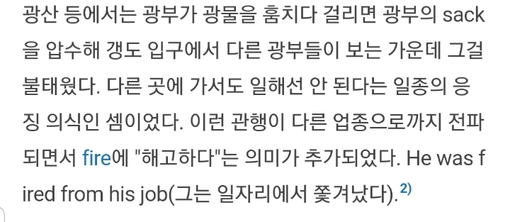 광부가 광물 훔치다 걸리면 광부의 짐자루(sack)를 불태워버려서 fire에... 해고하다라는 의미가 추가됨...