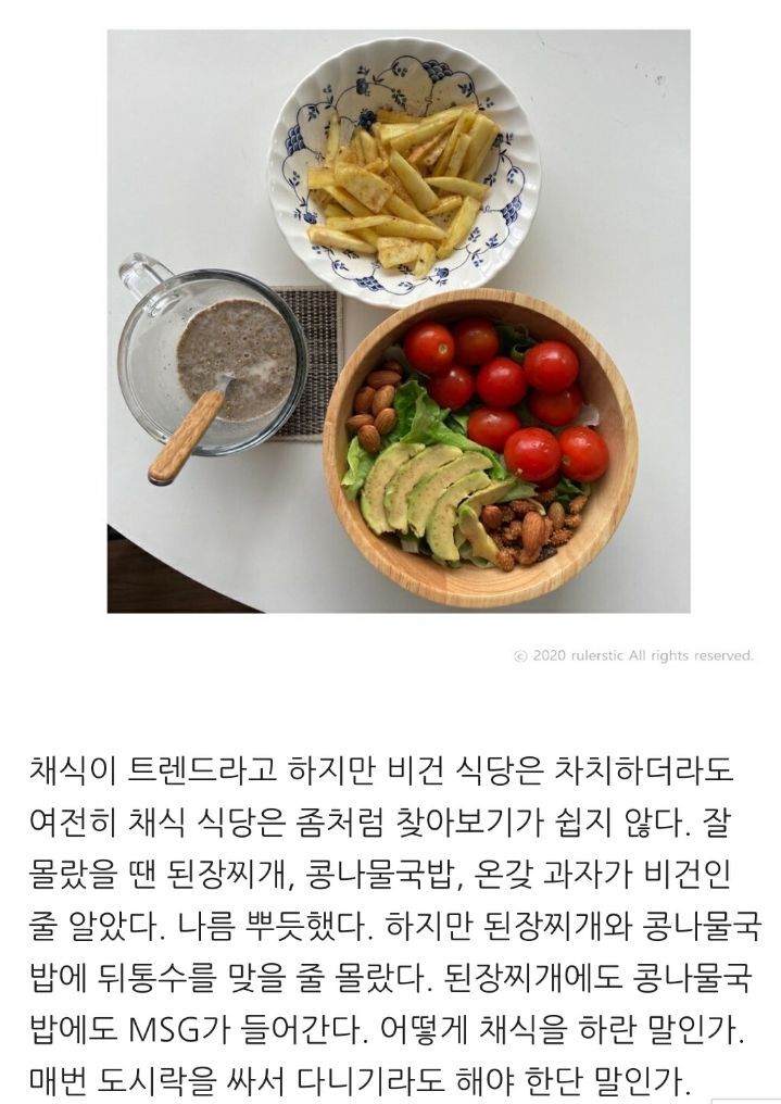 비건, 말이 쉽지, 실천은 어렵다. 도전해 본 사람은 알 것이다. 마음은 원이로되 육신은 약하다. 대다수가 실패하는 이유는 머리가 아니라 몸에 있다. 이외에도 저마다 비건 되기가 어려운 이유들이 있다. 육식을 해야만 하는, 할 수밖에 없는 환경에 처한 사람들이 있다. 비건 불모지 대한민국 국민이라는 것도 한몫한다. 직장 생활을 하면 대부분 식당에서 점심을 해결한다.