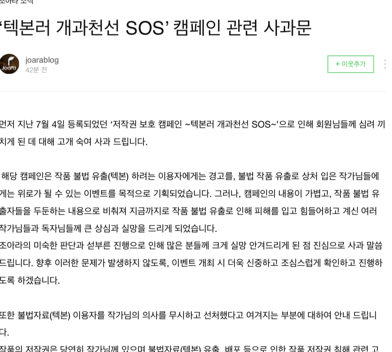 2. 조아라는 기껏 잡은 텍본러들을 미성년자라는 이유로 대리용서+심지어 텍본 찾는 모니터링 일까지 시켜줌+작가들한테는 아무런 동의도 받지 않음