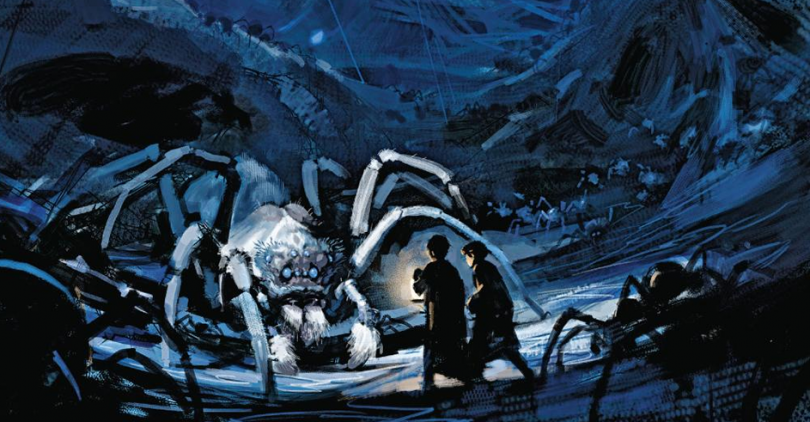 "돔처럼 둥글고 높으며 안개처럼 부옇게 보이는 거미줄 한가운데에서 작은 코끼리만 한 거미가 아주 천천히 나타났다. 거미의 검은 몸통과 다리에는 간간이 회색이 섞여 있었으며, 뾰족하게 솟아 있는 못생긴 머리에 달린 눈알들은 하나같이 우유처럼 탁한 흰색이었다."