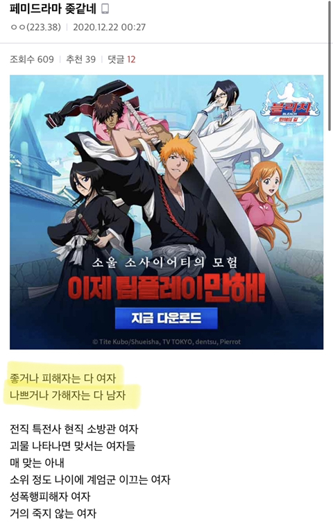 작성자예이얍 작성시간 21.01.13 이드라마 빼면 나머지는 전부 여자들이 하찮게 소비되잖아.... 이런식 평준화도아니고 전부 일방적인 여자소비가 넘쳐나는데 이거 평준화좀 했다고 바로 거부감 느끼는 한남들... 역시 자기들이 쥐고있는 걸 뺏길거같으니 바로 반응 오나봄