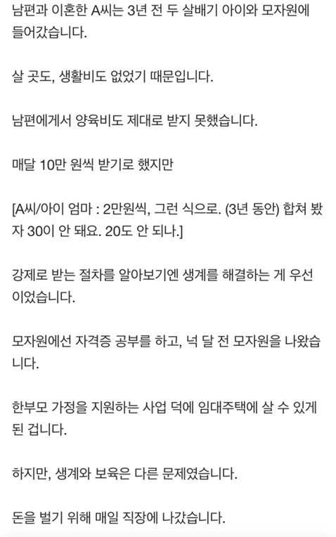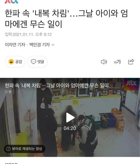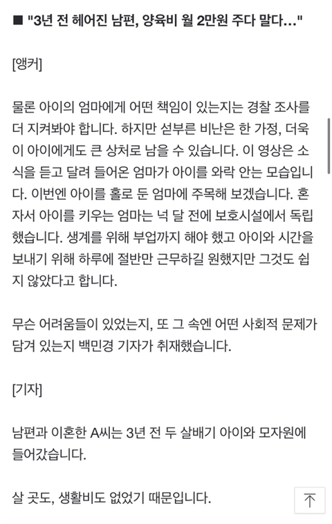 [여시뉴스데스크]한파 속 '내복 차림'…그날 아이와 엄마에겐 무슨 일이 작성자불판소고기|작성시간21.01.11|조회수3,503 목록 댓글 16 글자크기 작게가 글자크기 크게가 출처 : http://naver.me/IMQ5mmPh한파 속 '내복 차림'…그날 아이와 엄마에겐 무슨 일이[앵커] 지난 주말 사이에 보도되면서 많은 시민들을 화나게 하고 또 마음을 아프게 했던 영상입니다. 영하 13도의 날씨에 내복 차림으로 발견된 다섯 살 아이입니다. 학대를 받다 세상을 떠난 정n.news.naver.com 다음검색 현재 게시글 추가 기능 열기 북마크 공유하기 신고 센터로 신고 댓글 댓글 16 댓글쓰기 답글쓰기 댓글 리스트 작성자닭강정처돌이 | 작성시간 21.01.11 진짜 속상하다..... 양육비 뭐냐고 10만원도 어이없는데 2만원.... 작성자녹차부랍 | 작성시간 21.01.11 아유속상하다... 작성자저지방앤고칼슘 | 작성시간 21.01.11 개비새끼 잡아들이자 작성자푸드르르르르 | 작성시간 21.01.12 나라에서 직접 개비한테 돈받는 시스템으류 돌리면 안되나.... 작성자햅삐햅삐데이 | 작성시간 21.01.12 하 씨발 애비 양육비 나라에서 받아내줘여하는거 아니냐고 싸지르기만 하면 다냐? 댓글 전체보기
