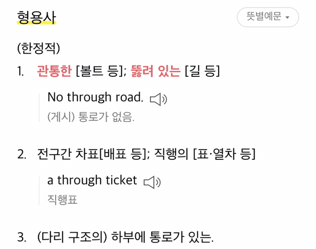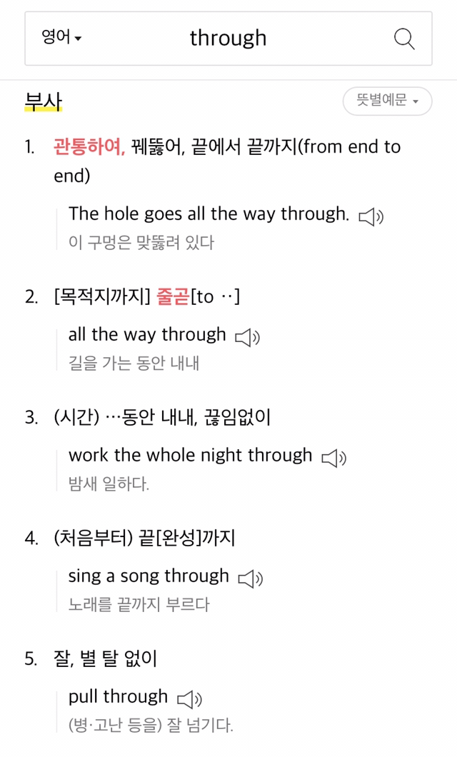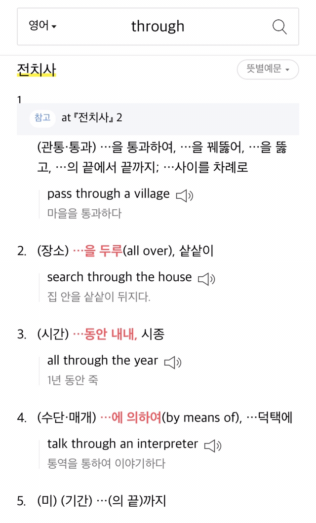 1번은 영단어 through의 원래 뜻 설명