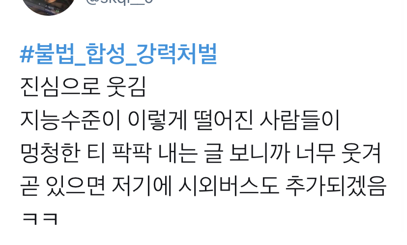 [흥미돋]알페스 위버스 리버스 오메가버스 (+곧 시외버스도 추가 될 예정) 작성자자축인묘진샤오미보조배터리|작성시간21.01.14|조회수11,530 목록 댓글 126 글자크기 작게가 글자크기 크게가 출처 : https://twitter.com/skql__0/status/1349600510408499200?s=21= on Twitter“#불법_합성_강력처벌 진심으로 웃김 지능수준이 이렇게 떨어진 사람들이 멍청한 티 팍팍 내는 글 보니까 너무 웃겨 곧 있으면 저기에 시외버스도 추가되겠음ㅋㅋ”twitter.com시외버스 만큼은 진짜 막아야 돼.... 다음검색 현재 게시글 추가 기능 열기 북마크 공유하기 신고 센터로 신고 댓글 댓글 126 댓글쓰기 답글쓰기 댓글 리스트 작성자그랑종 | 작성시간 21.01.15 ㅋㅋㅋㅋㅋㅋㅋㅋ 아군아냐..? 아군이 아니고서야.... 작성자갓지은_ | 작성시간 21.01.15 좌석버스는 외 않껴죠? 된장녀 시절부터 줘패더니 이런건 꼭 빼더라? 좌석버스도 껴조~~@!!! 작성자반빡 | 작성시간 21.01.15 아진심 개웃겨 죽겠네 작성자고양이똥꼬 귀여웝 | 작성시간 21.01.16 ㅋㅋㅋ30만?ㅋㅋㅋㅋ 느그 엔번방 회원이 27명인게 얼마나 공폰지 알겟노 작성자시진핑핑 | 작성시간 21.02.16 인큐버스는 없네 아쉽노 댓글 전체보기