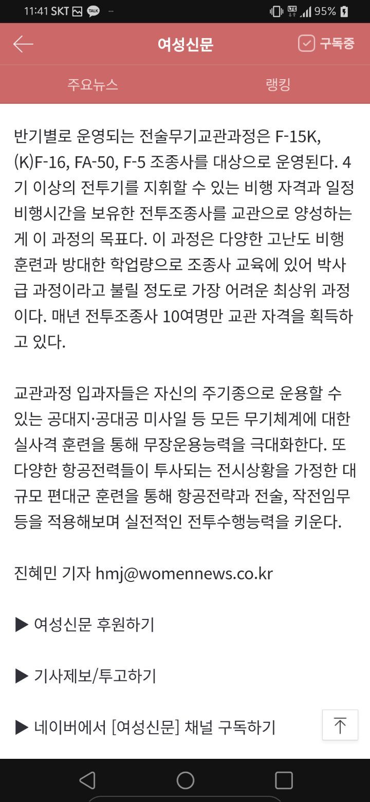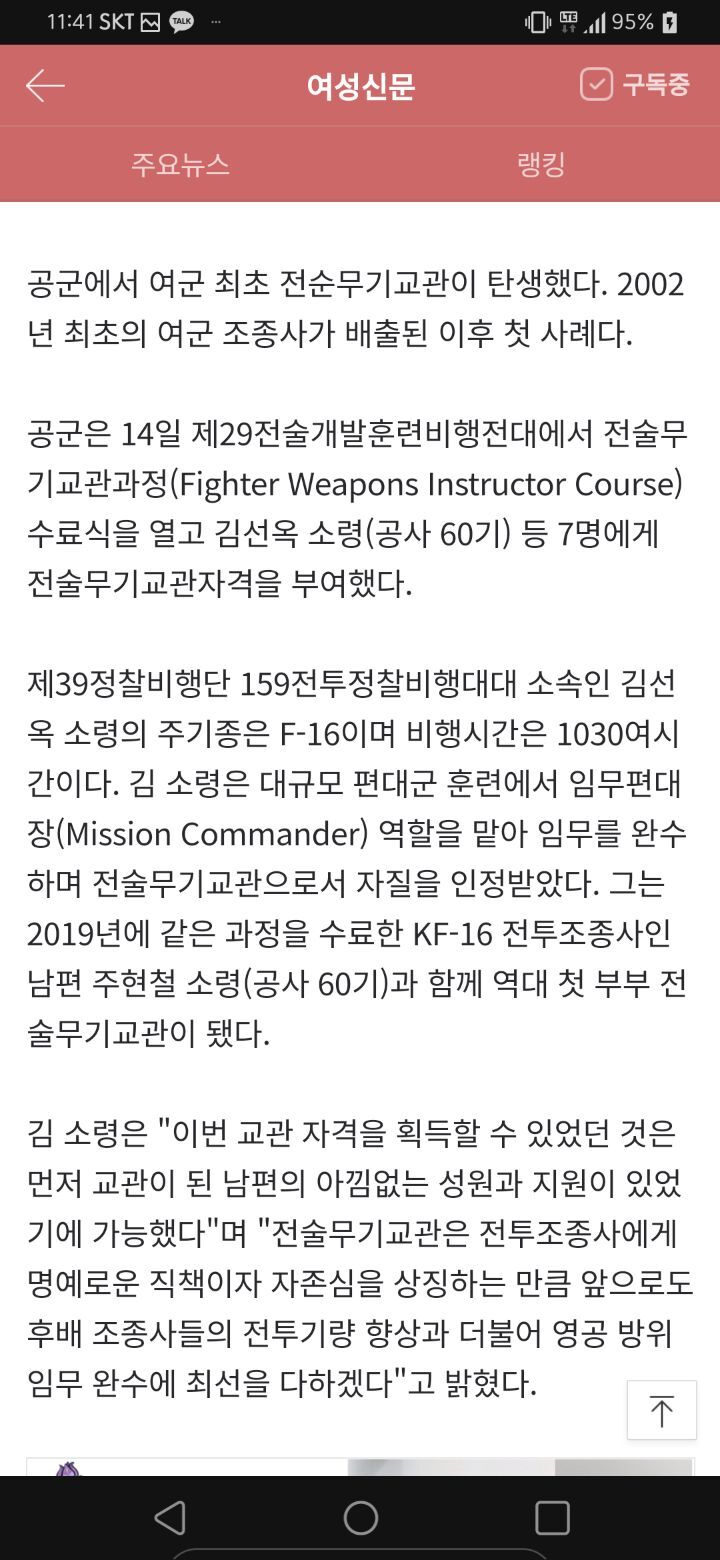 [여시뉴스데스크]공군 최초 여성 '전투기 조종 박사' 탄생... 1호 전술무기교관 김선옥 소령 작성자Anonymouse0|작성시간21.01.14|조회수1,285 목록 댓글 2 글자크기 작게가 글자크기 크게가 출처 : https://n.news.naver.com/article/310/0000083205?type=main공군 최초 여성 '전투기 조종 박사' 탄생... 1호 전술무기교관 김선옥 소령공군에서 여군 최초 전순무기교관이 탄생했다. 2002년 최초의 여군 조종사가 배출된 이후 첫 사례다. 공군은 14일 제29전술개발훈련비행전대에서 전술무기교관과정(Fighter Weapons Instructor Coun.news.naver.com 다음검색 현재 게시글 추가 기능 열기 북마크 공유하기 신고 센터로 신고 댓글 댓글 2 댓글쓰기 답글쓰기 댓글 리스트 작성자조우상 | 작성시간 21.01.14 대박 간지야 ㅠㅠ 진짜 멋있다 작성자니트조끼 | 작성시간 21.01.15 멋지시다!! 댓글 전체보기