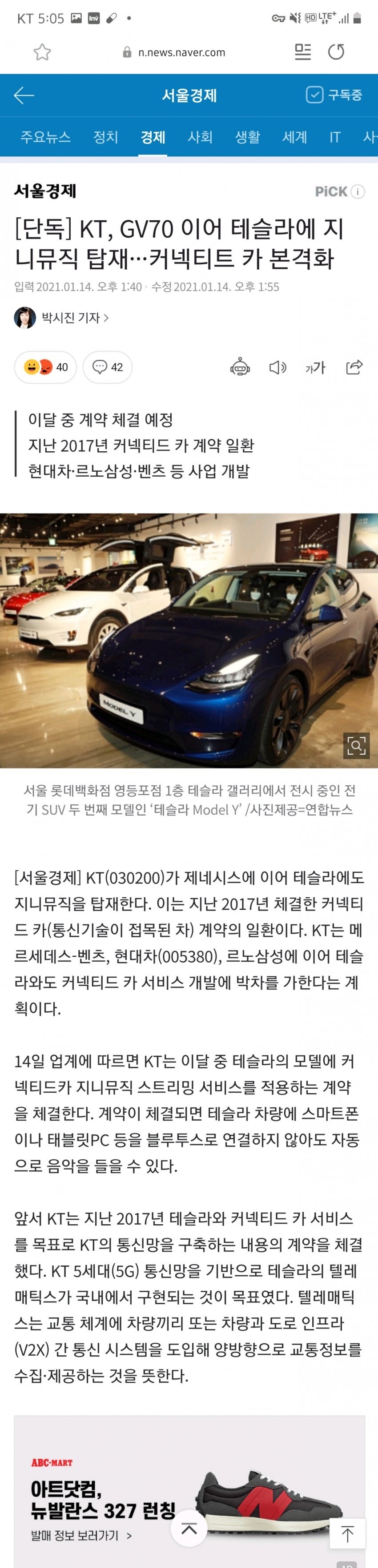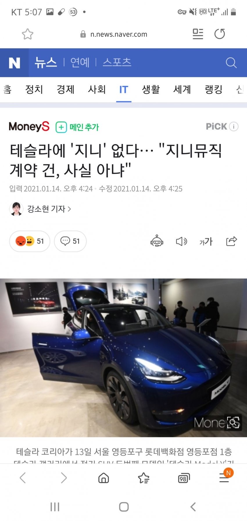 테슬라에 지니뮤직 탑재!!!!!!!!이건 크다!! KT가즈아!!