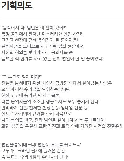 시청자들도 추리에 빠지고 연기에 빠지며 재밌게 시청할 수 있는 것이 크라임씬의 매력인것 같음