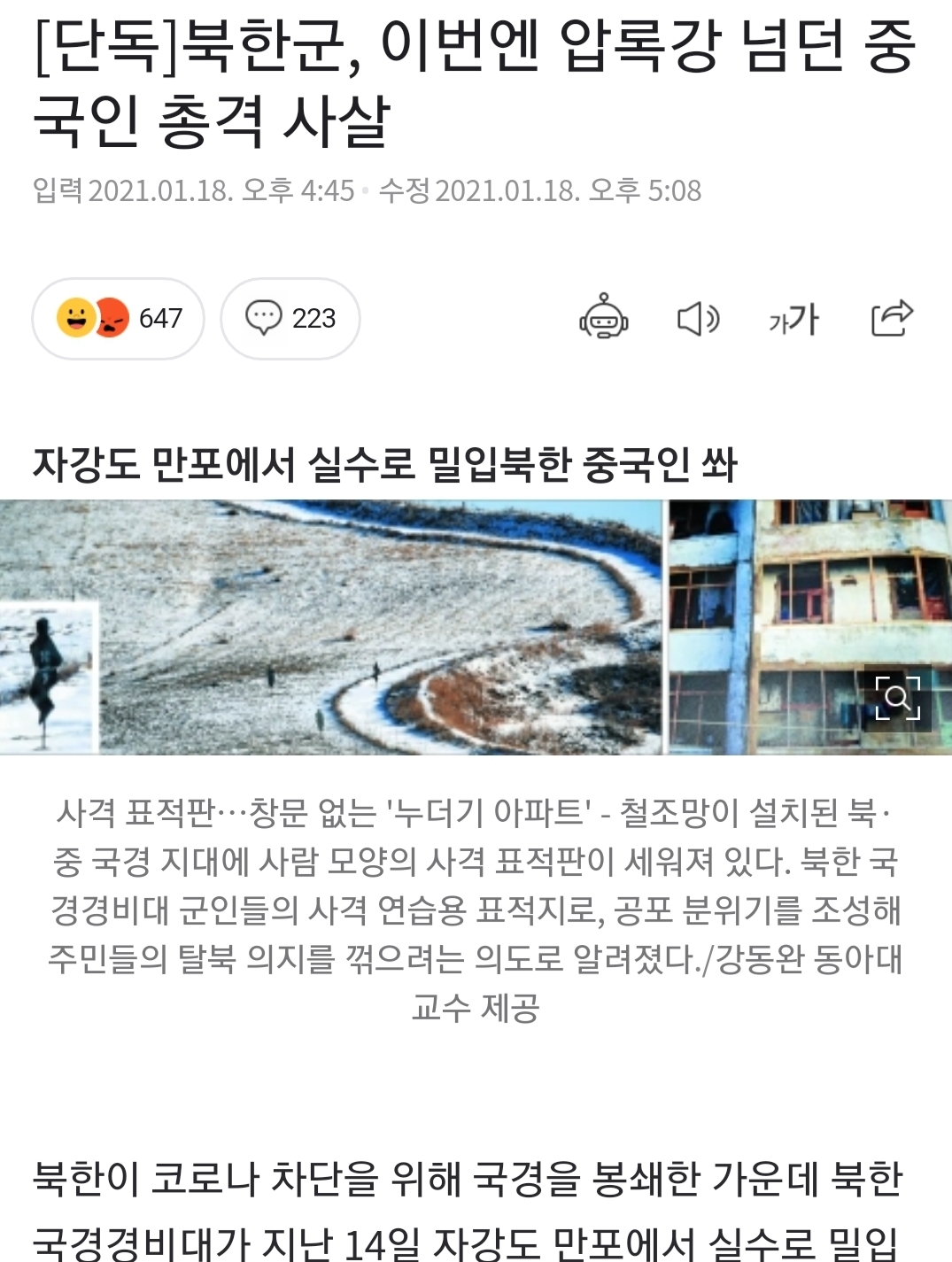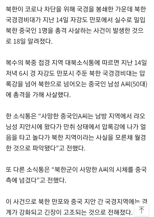 [여시뉴스데스크][단독]북한군, 이번엔 압록강 넘던 중국인 총격 사살 작성자그린티라떼샷추가|작성시간21.01.18|조회수4,156 목록 댓글 37 글자크기 작게가 글자크기 크게가 출처 : https://n.news.naver.com/article/023/0003590590[단독]북한군, 이번엔 압록강 넘던 중국인 총격 사살자강도 만포에서 실수로 밀입북한 중국인 쏴 북한이 코로나 차단을 위해 국경을 봉쇄한 가운데 북한 국경경비대가 지난 14일 자강도 만포에서 실수로 밀입북한 중국인 1명을 총격 사살하는 사건n.news.naver.com헐..만취상태로 북한에 왜 밀입국함;;착짱죽짱인데 착한 중국인이 한명 더 늘은 건 👍 다음검색 현재 게시글 추가 기능 열기 북마크 공유하기 신고 센터로 신고 댓글 댓글 37 댓글쓰기 답글쓰기 댓글 리스트 작성자내맘알지 | 작성시간 21.01.18 굿다이노 작성자여러개의 중국을 지지합니다 | 작성시간 21.01.18 넘넘 잘했어요~!~!^^* 작성자빠듯빠듯자빱 | 작성시간 21.01.18 굿 사격 작성자세인트 엑소시스트 | 작성시간 21.01.18 애초에 남의땅을 밟지 말았어야지 작성자뚱띵이 | 작성시간 21.01.19 고구려 패기 인정 댓글 전체보기