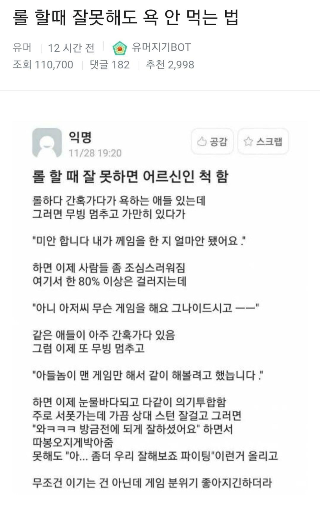 작성자신중한구매 작성시간 21.01.22 일단 아이디가 중요함..80프로 이상 먹고 들어가ㅋㅋㅋㅋㅋㅋㅋㅋ 돌주먹 POWER MUSCLE 이런거 해놓고 욕박으면 아 거 좀 갱생의 마음으로 하는데 이해좀해주이소 이런거 치거나. 시작전에 휴가 나와서 간만에 합니다 못해도 이해해주세요 행님덜~~~ 이런거 치면 욕안하던데 옵치에선 그랬음ㅋㅋㅋㅋㅋ아이디가 중요해... 그리고 신고 적극활용..