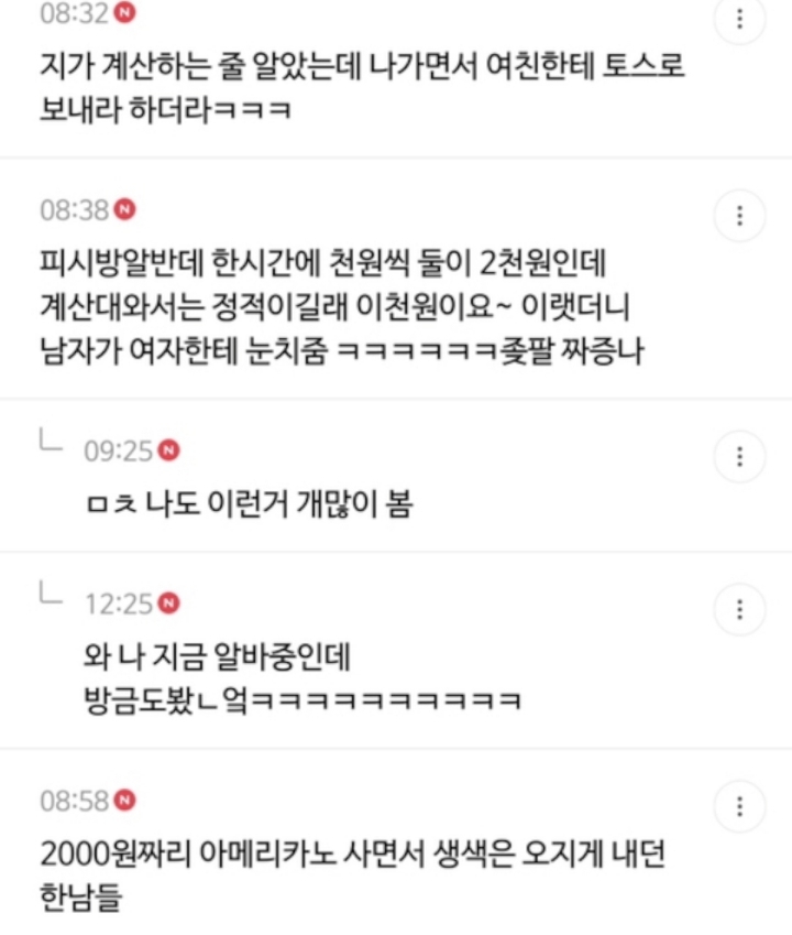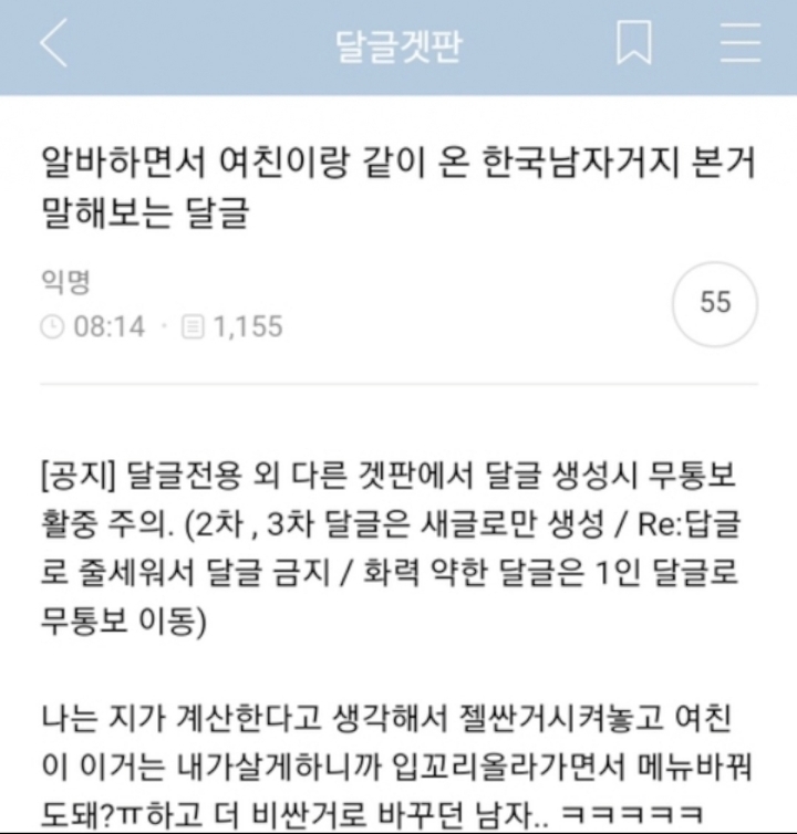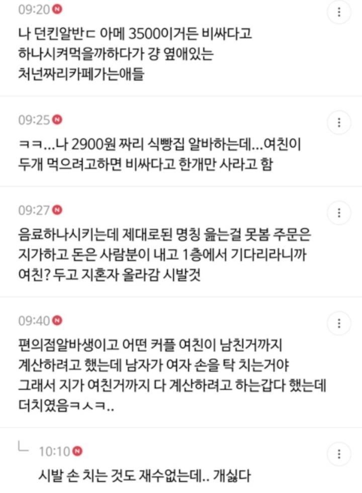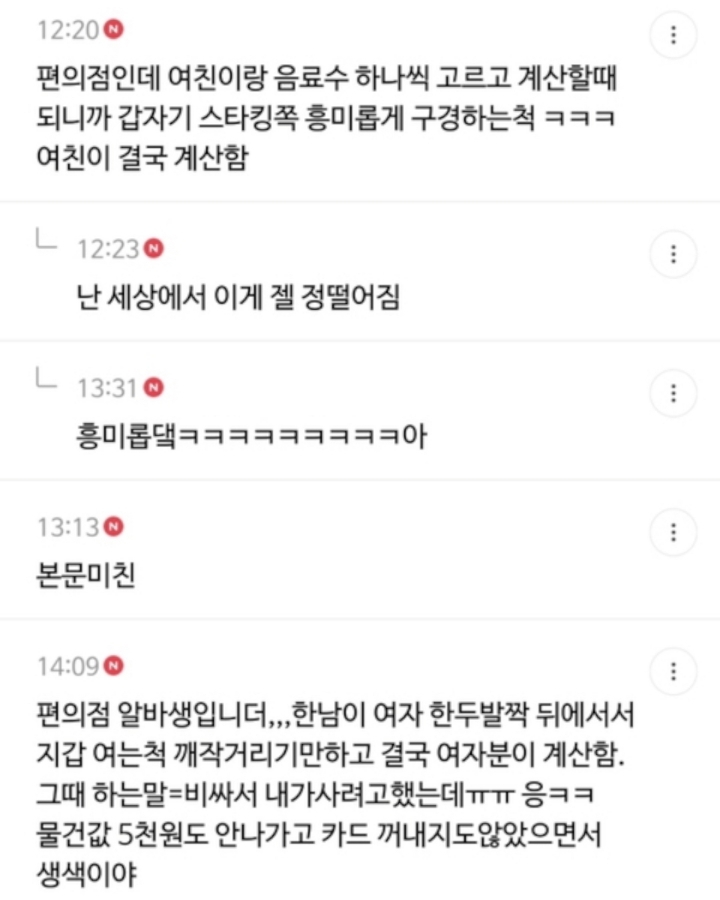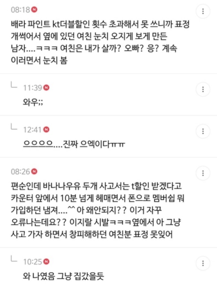 작성자어쩔어쩔용 작성시간 21.01.26 편알인데 매번와서 여자카드로 콘돔 계산시키는 병신있음 에휴 매번 지 음료 같이계산하라그러고