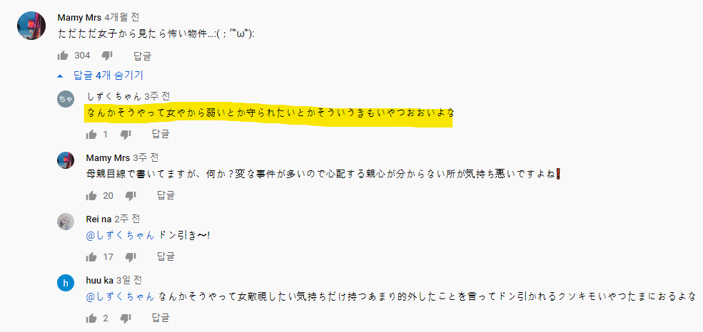 '이런 식으로 여자라서 약하다든지 지켜줬으면 하고 바라는 기분나쁜 년들 많네'