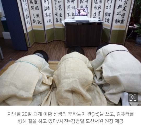 #지난달 20일 머리가 희끗희끗한 퇴계 이황 선생의 후학들이 관(冠)을쓰고, 컴퓨터를 향해 절을 했다. ‘코로나19’로 5인 이상 모임이 제한되자 불천위(不遷位) 제사를 온라인으로 지냈다. 평소 같으면 종택의 앞마당까지 사람들이 가득 차지만 올해는 인터넷 화상회의 플랫폼인 ‘줌’에서 모였다.