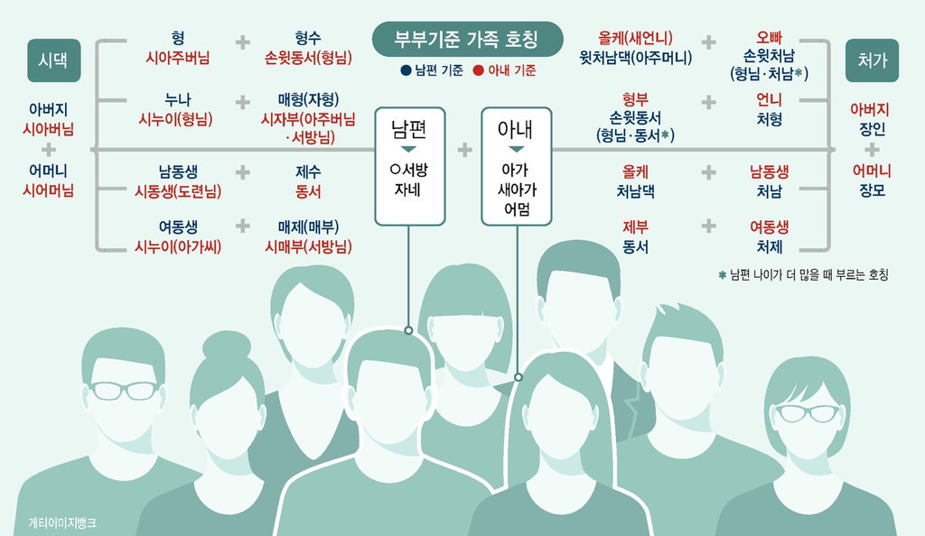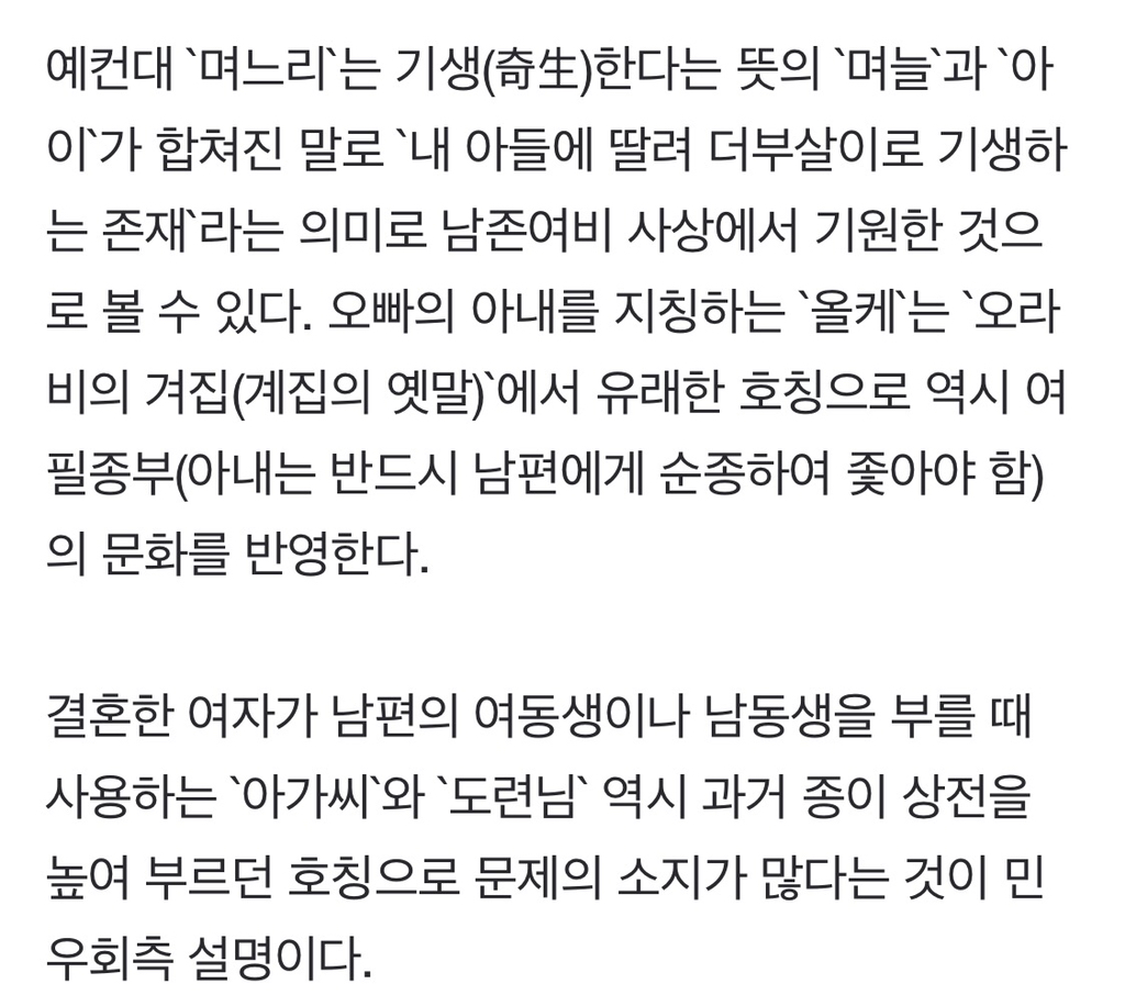 `며느리`는 기생(奇生)한다는 뜻의 `며늘`과 `아이`가 합쳐진 말로 `내 아들에 딸려 더부살이로 기생하는 존재`라는 의미로 남존여비 사상에서 기원한 것으로 볼 수 있다. 오빠의 아내를 지칭하는 `올케`는 `오라비의 겨집(계집의 옛말)`에서 유래한 호칭으로 역시 여필종부(아내는 반드시 남편에게 순종하여 좇아야 함)의 문화를 반영한다.