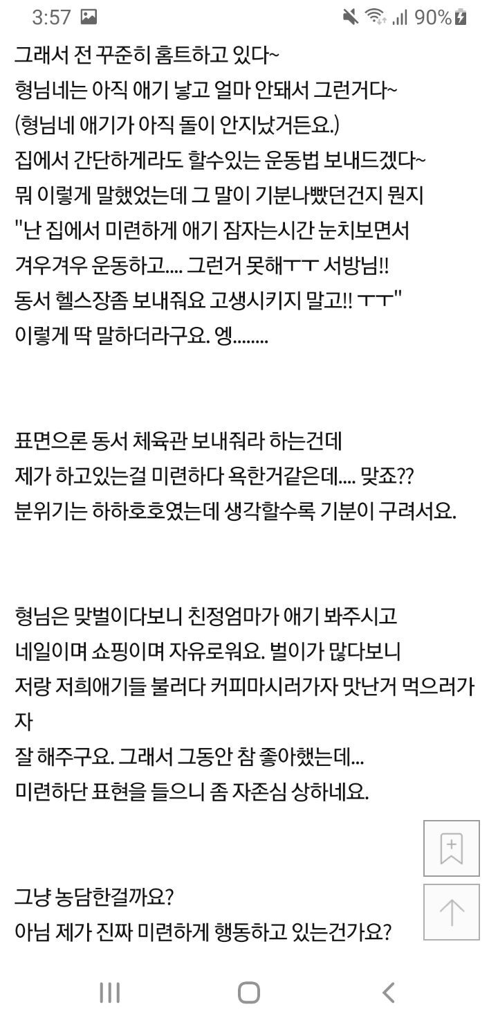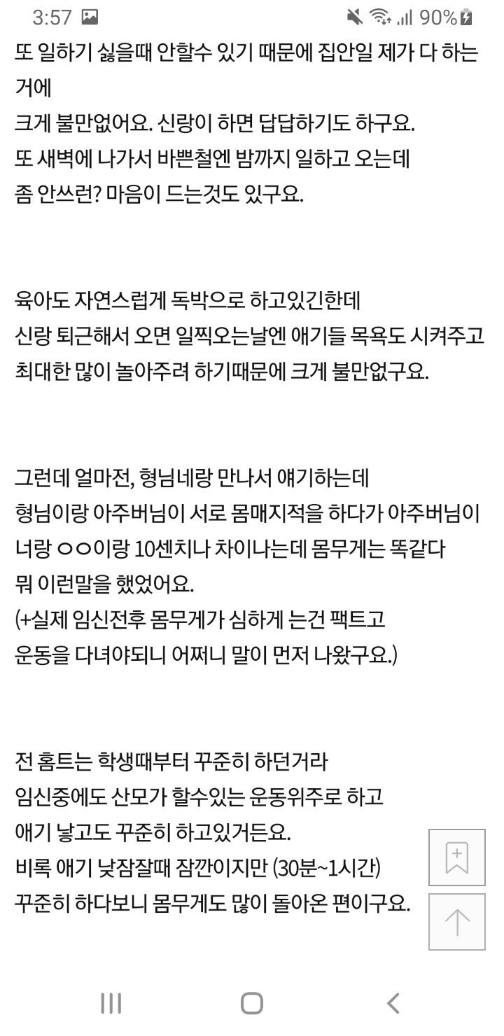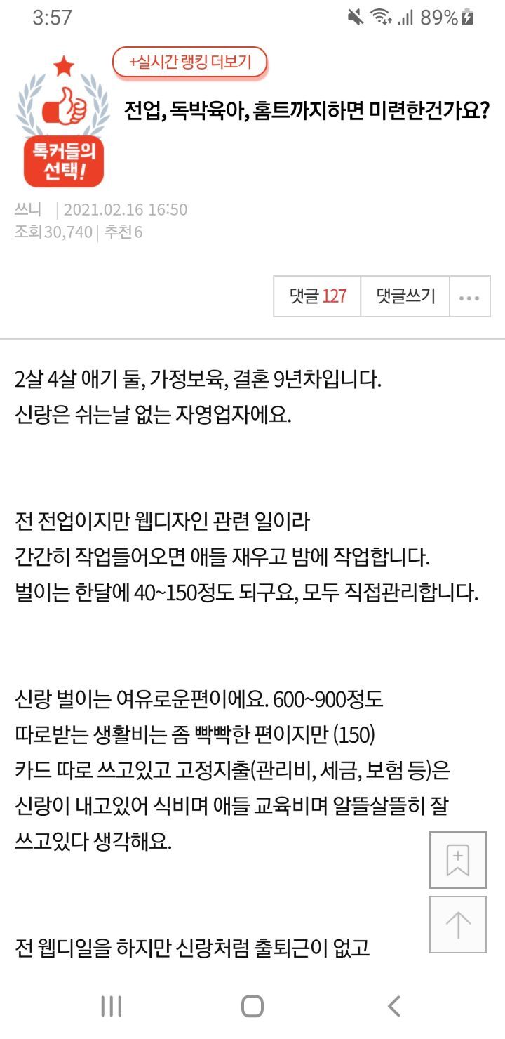 [기타]전업, 독박육아, 홈트까지하면 미련한건가요? 작성자미둥|작성시간21.02.17|조회수5,746 목록 댓글 34 글자크기 작게가 글자크기 크게가 출처 : https://m.pann.nate.com/talk/357744514?currMenu=talker&order=RAN&rankingType=total&page=5전업, 독박육아, 홈트까지하면 미련한건가요?2살 4살 애기 둘, 가정보육, 결혼 9년차입니다. 신랑은 쉬는날 없는 자영업자에요. 전 전업이지만 웹디자인 관련 일이라 간간히 작업들어오면 애들 재우고 밤에 작업합니다. 벌이는 한달에 40~150pann.nate.com나도 이런 남편 만나고 싶다... (글쓴이 같은 남편) 다음검색 현재 게시글 추가 기능 열기 북마크 공유하기 신고 센터로 신고 댓글 댓글 34 댓글쓰기 답글쓰기 댓글 리스트 작성자키요하루 | 작성시간 21.02.17 맞벌이 형님 네일 지적은 왜 해 그동안 잘 얻어먹어놓고 작성자고만해 | 작성시간 21.02.17 생활비 뭐노 작성자무당은볼이빨개 | 작성시간 21.02.17 형님빼고 모두가 별로임 작성자어?이쁘다 | 작성시간 21.02.18 형님만이 정상임 작성자우주최강존엄뚱땅님 | 작성시간 21.02.20 네 존나 미련합니다ㅠ 심지어 남편 안쓰럽대ㅋㅋㅋㅋㅋㅋㅋㅋㅋㅋㅋㅋㅋㅋㅋㅋㅋㅋㅋㅋㅋㅋㅋㅋㅋㅋㅋㅋㅋㅋㅋ 댓글 전체보기