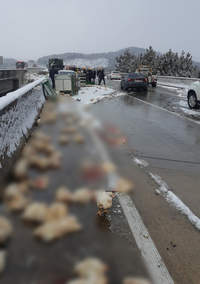 사고 충격으로 화물차에 실려 있던 닭장 우리가 넘어지면서 닭 500여 마리가 도로에 쏟아져 1개 차선을 통제하고 안전 조치했다.