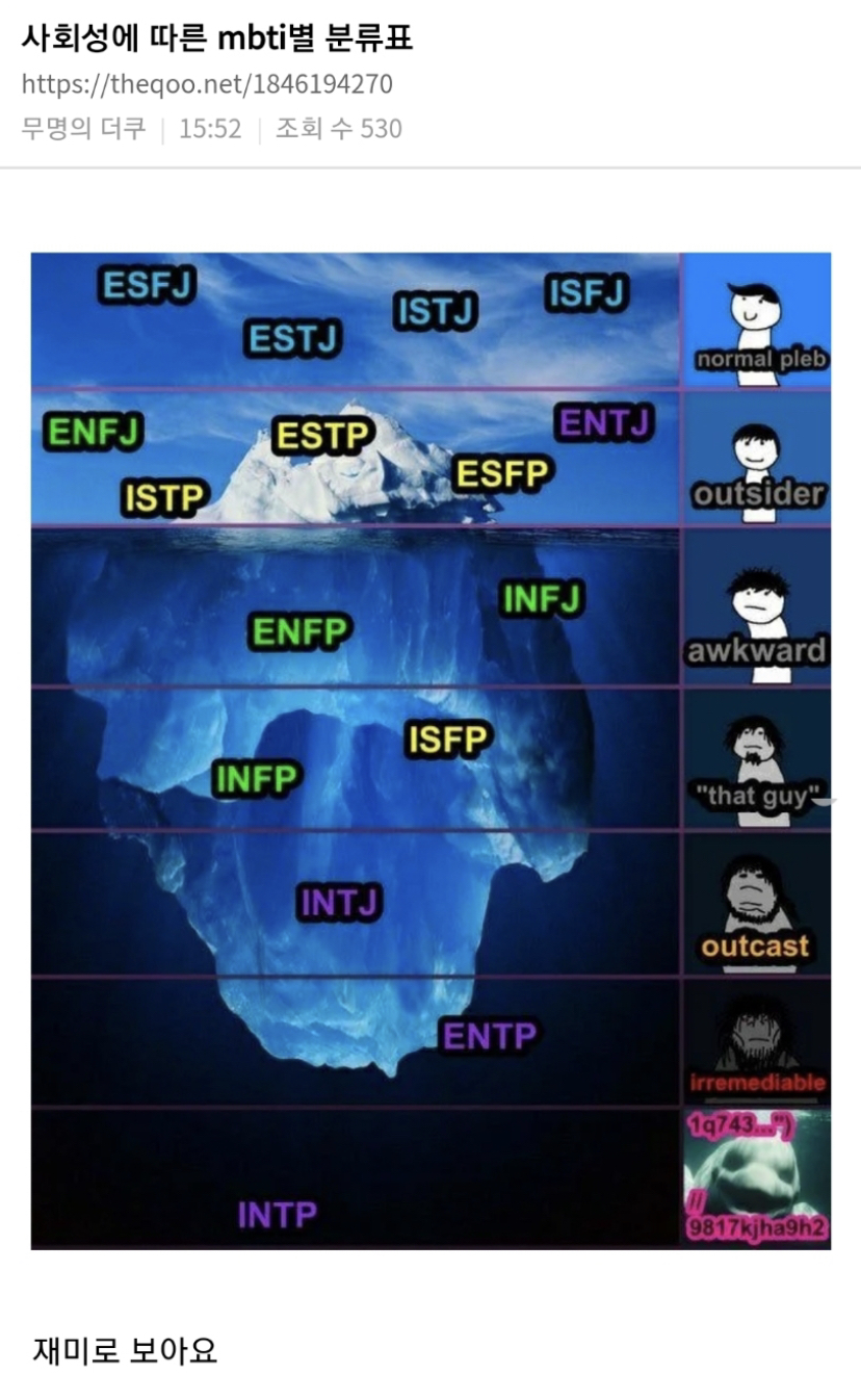 작성자커피더판다 작성시간 21.02.23 istj인데 이해안된닼ㅋㅋㅋㅋ 근데 intp 인정.. 내 남사친 intp인뎈ㅋㅋ 졸 특이해.... 이상해..심오하고 내성적이고..매력은 있는데 약간 대화 안통해 ㅋㅋ