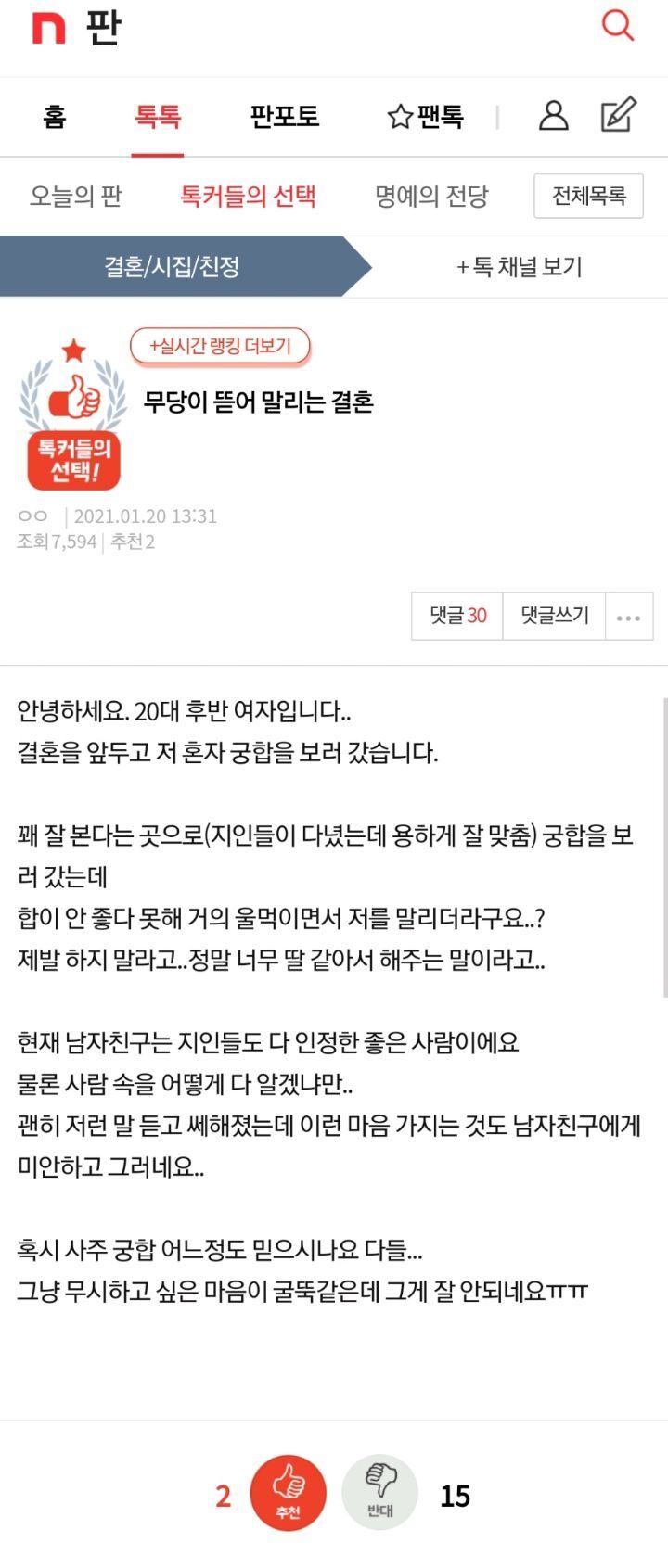 [스크랩] [토론싸워야제맛]무당이 뜯어 말리는 결혼, 한다vs안한다 작성자다들그렇게산다|작성시간21.02.17|조회수7,917 목록 댓글 60 글자크기 작게가 글자크기 크게가 출처 :https://m.pann.nate.com/talk/357090286?currMenu=talker&order=RAN&rankingType=total&page=71. 사주, 무속신앙 믿음.. 다른 곳도 몇 군데 가보고 결정함2. ㅋㅋ안믿음! 내가 본 것만 믿는다. 결혼할거임3. 기타. 믿는 건 아닌데 일단 가능성은 열어둠. 다른 무당집 가거나 하지는 않겠지만 혹시 모르니 내가 모르는 남친의 이면이 있나 의심을 시작해봄. 다음검색 스크랩 원문 : *여성시대* 차분한 20대들의 알흠다운 공간 현재 게시글 추가 기능 열기 북마크 공유하기 신고 센터로 신고 댓글 댓글 60 댓글쓰기 답글쓰기 댓글 리스트 작성자어퍼컷 | 작성시간 21.02.18 여기저기 더 다녀봐야함 작성자55kg이 최종 목표 | 작성시간 21.02.18 다른데도 가보자 작성자주문하신 아이야 | 작성시간 21.02.18 여러군데에서 똑같이 말하거나 저 무당이 자세한 설명을 해준다면 다시생각한다.... 그게아니라면 무시 작성자이이이이디 | 작성시간 21.02.18 애초에 무당한테 안갔으면 몰라도 몇군데 더 가볼듯 작성자인티제강쥐 | 작성시간 21.02.18 남자댓글들 보니까 무당말 꼭 듣고 안해야겟당ㅋㅋㅋ 댓글 전체보기