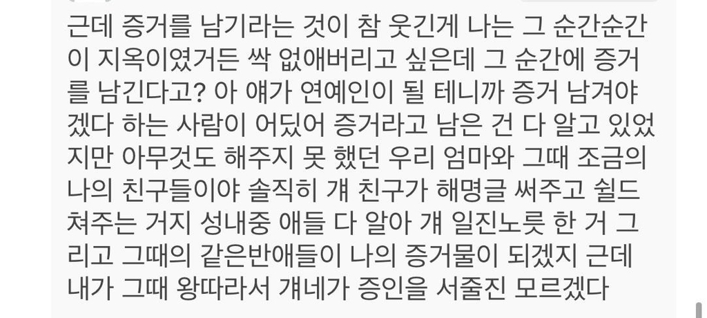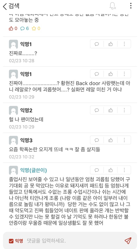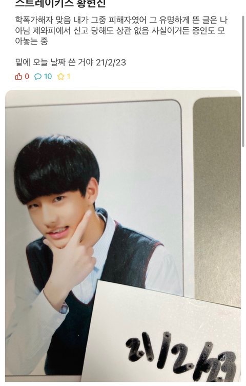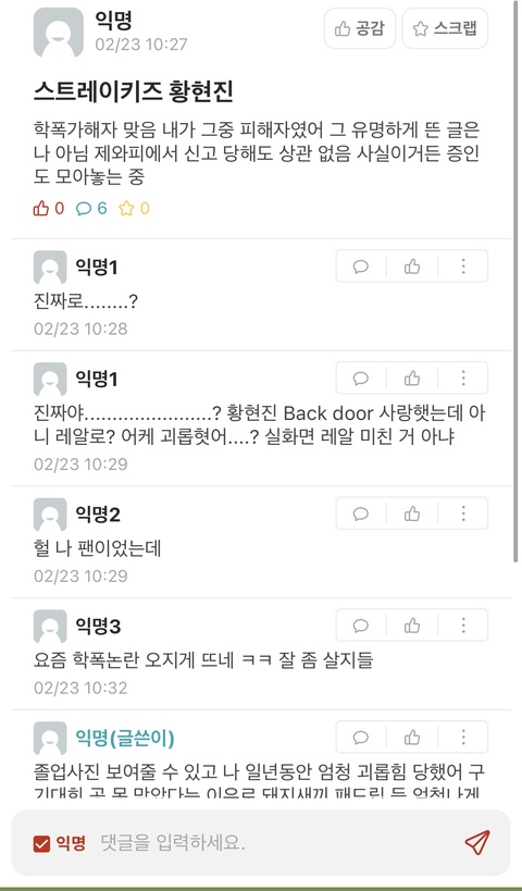 [스크랩] [기타]스키즈 황현진 새로운 학폭 피해자 (에타) 작성자흑당 노움|작성시간21.02.23|조회수17,545 목록 댓글 30 글자크기 작게가 글자크기 크게가 + 이건 추가 현진 동창들 증언 빨리 제와피 입장문 내야할듯 다음검색 스크랩 원문 : 쭉빵카페 현재 게시글 추가 기능 열기 북마크 공유하기 신고 센터로 신고 댓글 댓글 30 댓글쓰기 답글쓰기 댓글 리스트 작성자duvf | 작성시간 21.02.23 연예계 은퇴해라 걍ㅋ 작성자둥지를틀어봐 | 작성시간 21.02.23 개짜증이다 진심 작성자엔티제강쥐 | 작성시간 21.02.23 와 얘는 진짜 다 화력 적네 작성자나멀라팸 | 작성시간 21.02.23 와 진짜 작성자겨드랑스 | 작성시간 21.02.24 제왑 퇴출좀 댓글 전체보기