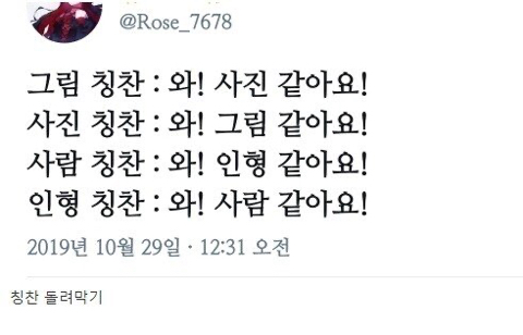 [스크랩] [흥미돋]한국식 칭찬 특징 작성자숙면중|작성시간21.02.26|조회수6,769 목록 댓글 17 글자크기 작게가 글자크기 크게가 출처 트위터집밥 칭찬 : 와! 가게에서 파는 것 같아요!가게 음식 칭찬 : 와! 집밥 같아요! 다음검색 스크랩 원문 : 쭉빵카페 현재 게시글 추가 기능 열기 북마크 공유하기 신고 센터로 신고 댓글 댓글 17 댓글쓰기 답글쓰기 댓글 리스트 답댓글 작성자결혼식하객룩 | 작성시간 21.02.26 장금이 여시ㅋㅋㅋㅋ 작성자아시어벌써12시 | 작성시간 21.02.26 ㅌㅋㅌㅌㅌㅋㅋㅋㅋㅋㅋㅋㅋ 작성자어어어어어엉 | 작성시간 21.02.26 ㅋㅋㅋㅋㅋㅋㅋㅋㅋㅋㅋㅋㅋㅋㅋㅋㅋㅋ 작성자딥디크 오로즈 | 작성시간 21.02.26 ㅋㅋㅋㅋㅋㅋㅋㅋㅋㅋㅋ ㅇㅈ 작성자에레카란 | 작성시간 21.02.26 ㅋㅋㅋㅋㅋㅋㅋㅋㅋㅋㅋㅋ한국만 그런거야? 만국공통일듯ㅋㅋㅋ 댓글 전체보기