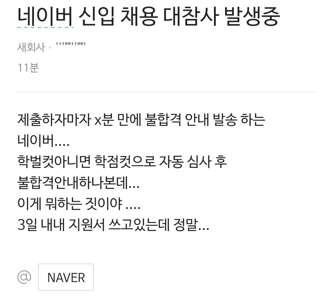 [스크랩] [흥미돋]현재 네이버 신입 채용 대참사 썰 돌고 있는 중.jpg 작성자새별강쥐|작성시간21.02.28|조회수35,245 목록 댓글 78 글자크기 작게가 글자크기 크게가 이게 사실이라면 지원서 쓰고있던 취준생들 박탈감 좀 느끼겠는데...ㅠ ㅊㅊ 펨코 다음검색 스크랩 원문 : 도탁스 (DOTAX) 현재 게시글 추가 기능 열기 북마크 공유하기 신고 센터로 신고 댓글 댓글 78 댓글쓰기 답글쓰기 댓글 리스트 작성자건전한 배틀태그 | 작성시간 21.03.01 생각해보니 네이버 다니는 주변 사람들 다 서울대네.. 시발 작성자Hannams | 작성시간 21.03.01 차라리 빨리 알려줘서 나은거같은데 난 ㅠㅋㅋㅋ 작성자skdhdhdh | 작성시간 21.03.01 그린일베 수준... 작성자Hanginthere | 작성시간 21.03.01 애초에 자격요건에 기재를 해라 작성자취준겟판 | 작성시간 21.03.01 그면 학벌로 1차 거르고 그때 자소서 쓰라고 시켜야지 쉬이발 댓글 전체보기