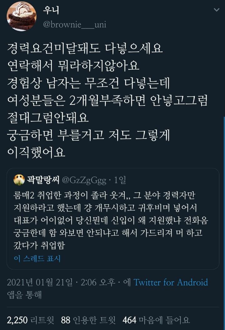 작성자엑그게뭐에여 작성시간 21.03.13 나 외국계 대기업도 저런식으로 최종까지 봤었어! 심지어 경력이랑 연관적은 직무였고 연차도 내 경력보다 높았던ㅋㅋㅋ 면접에서도 경력 부족하다 뭐 그런말 안하더라ㅋㅋ