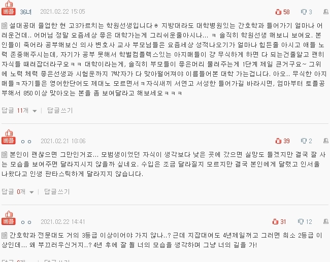 작성자레서판다덕후 작성시간 21.03.12 아니 간호대면 열심히 한것같구만 그리고 설령 의약계열 아니라고해도 엄마가 돼서 저런 말을 하면 안되지 어휴