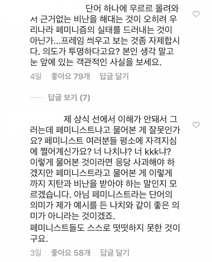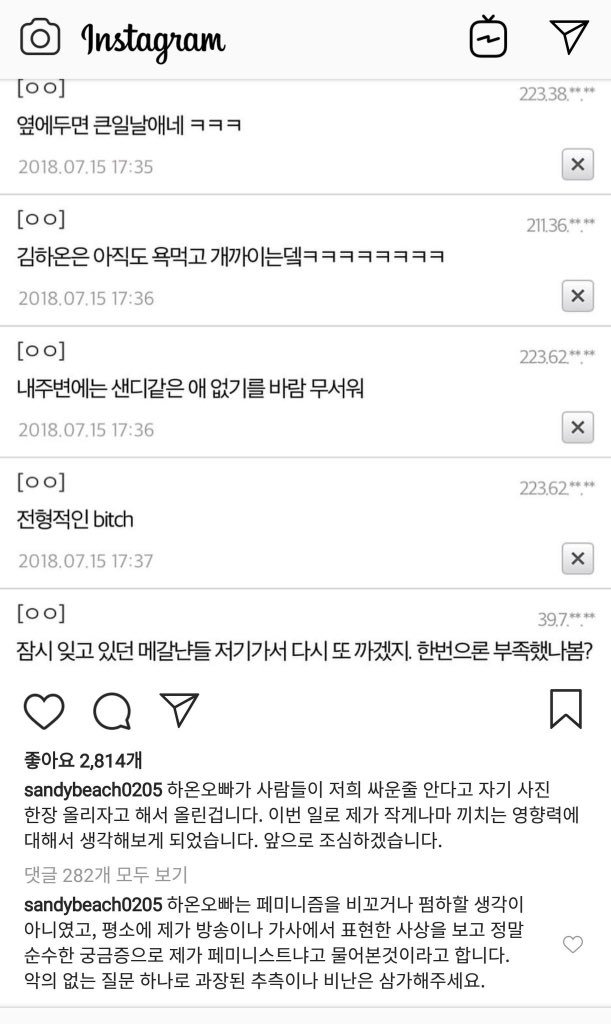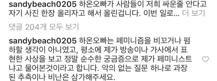 >>평소에 제가 방송이나 가사에서 표현한 사상을 보고 정말 순수한 궁금증으로 제가 페미니스트냐고 물어본것이라고 합니다<<