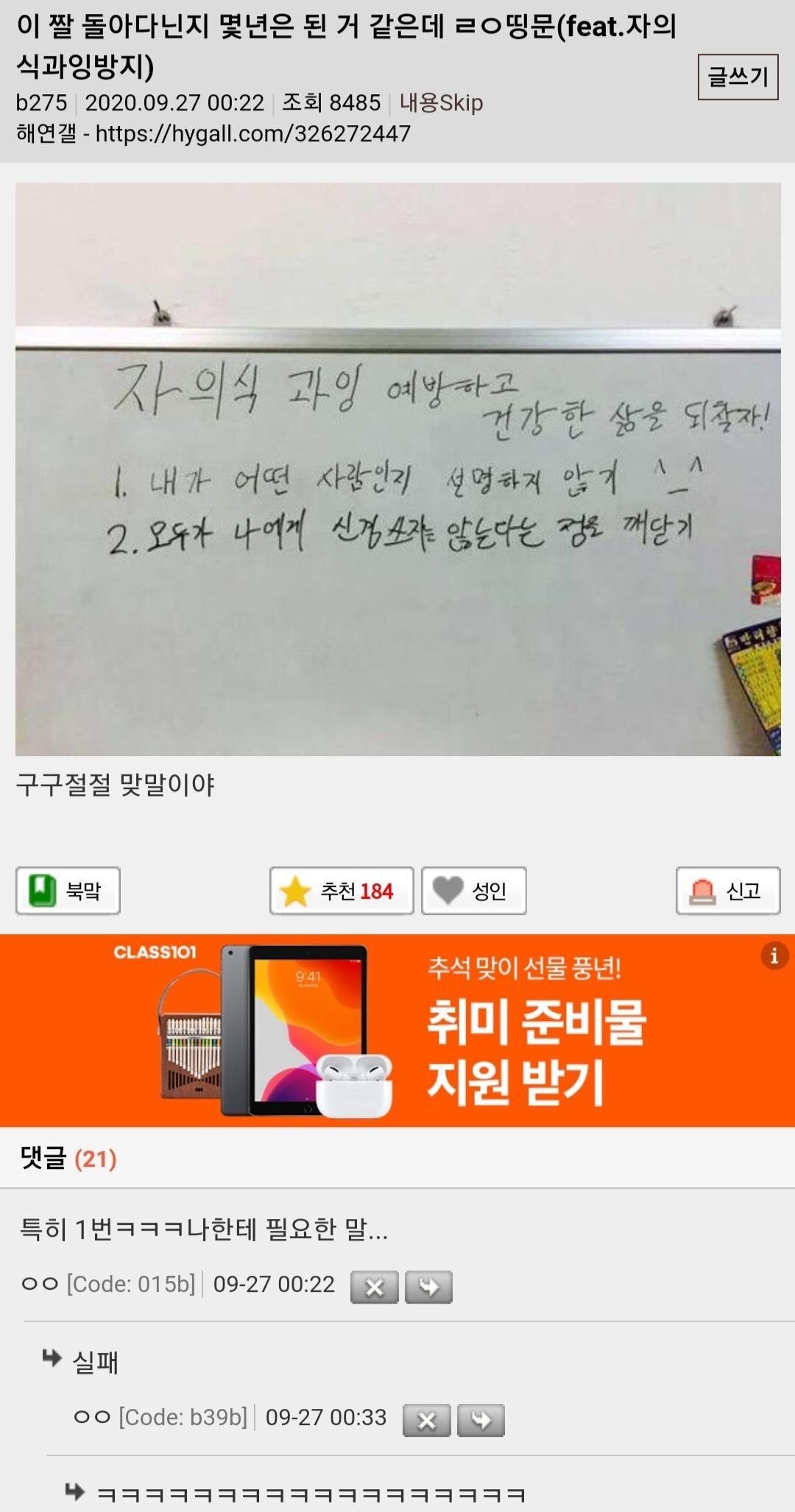 [스크랩] [흥미돋]자의식 과잉 예방하고 건강한 삶을 되찾자.jpg 작성자클다자라고추|작성시간21.03.24|조회수5,010 목록 댓글 4 글자크기 작게가 글자크기 크게가 출처 : 여성시대 그린티라떼샷추가1번이 자의식 과잉이었군... 다음검색 스크랩 원문 : *여성시대* 차분한 20대들의 알흠다운 공간 현재 게시글 추가 기능 열기 북마크 공유하기 신고 센터로 신고 댓글 댓글 4 댓글쓰기 답글쓰기 댓글 리스트 작성자안준며듦 | 작성시간 21.03.24 ㅋㅋ 아존나웃기다 작성자이케아광와쥐 | 작성시간 21.03.24 아미틴ㅋㅋㅋㅋㅋㅋㅋㅋㅋㅋㅋㅋㅋㅋㅋㅋ 댓글이 완성함ㅋㅋㅋㅋㅋㅋ 작성자느개비너구리에다시마두개보고오열함 | 작성시간 21.03.24 그와중에 실패ㅋㅋㅋㅋ 작성자빅히트 | 작성시간 21.03.24 ㅋㅋㅋㅋㅋㅋㅋㅋㅋㅋㅋㅋㅋ댓글이완성 댓글 전체보기